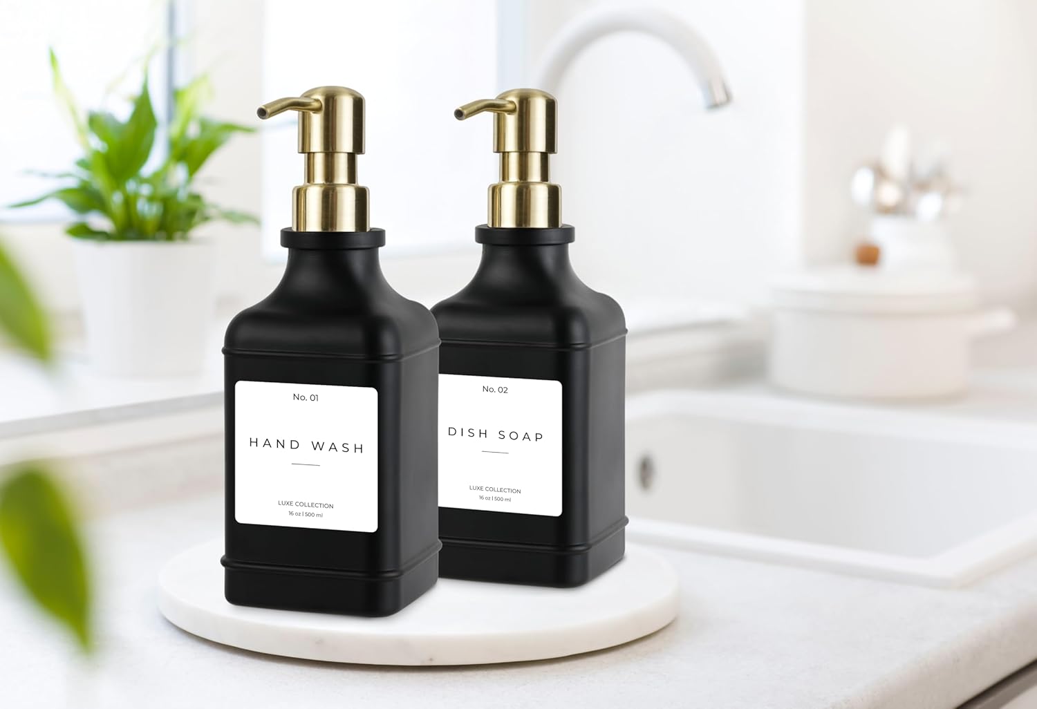 Emerson Essentials Soap Dispenser, Dish Soap Dispenser, Soap Bottle Dispenser Bathroom Set, Hand Soap Dispenser, Kitchen Soap Dispenser Set, Glass Soap Dispenser Pump + Labels | 16 Oz, 2-Pack