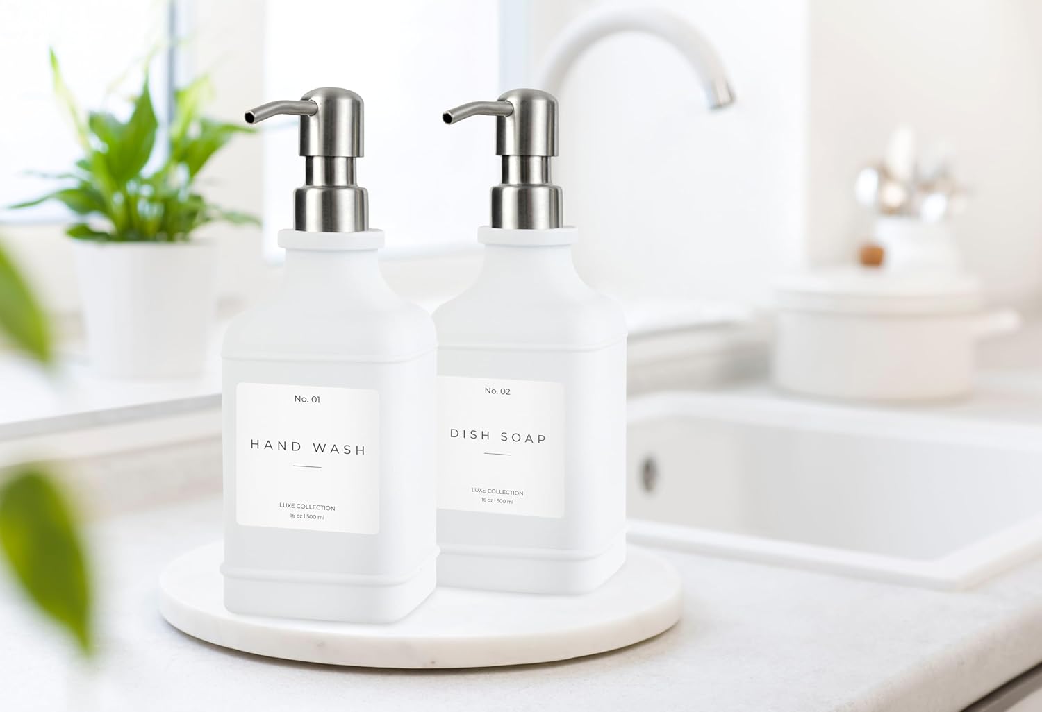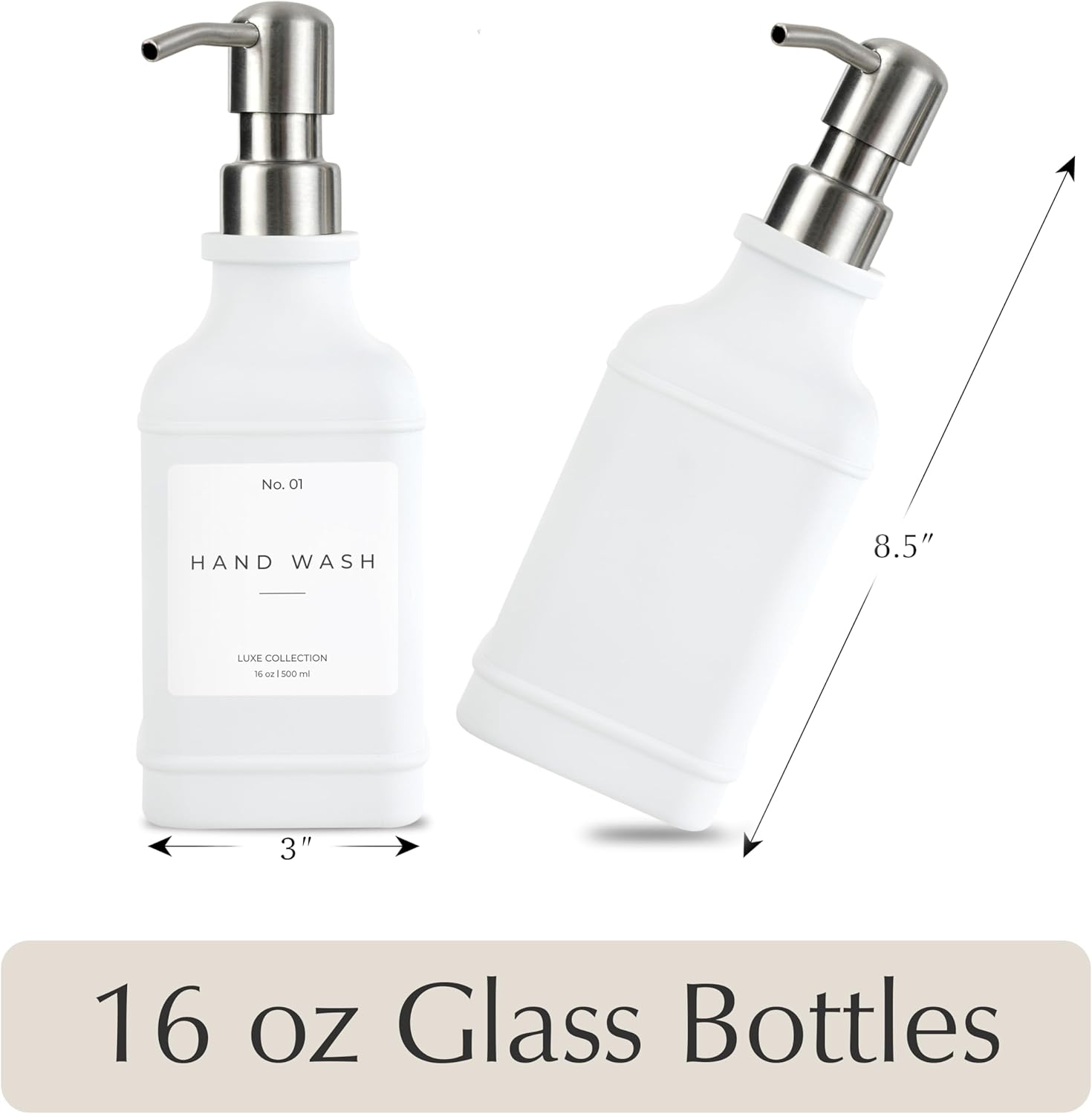 - ✅ 2 PACK: While other dispensers peel over time, our dispensers are made of premium quality and last far longer. The bathroom soap dispensers and kitchen soap dispenser set are 16 ounces and are refillable, requiring fewer refills. Ideal for using as a bathroom soap dispenser set and the glass soap dispenser with pumps boast 2 cc stainless steel pumps.