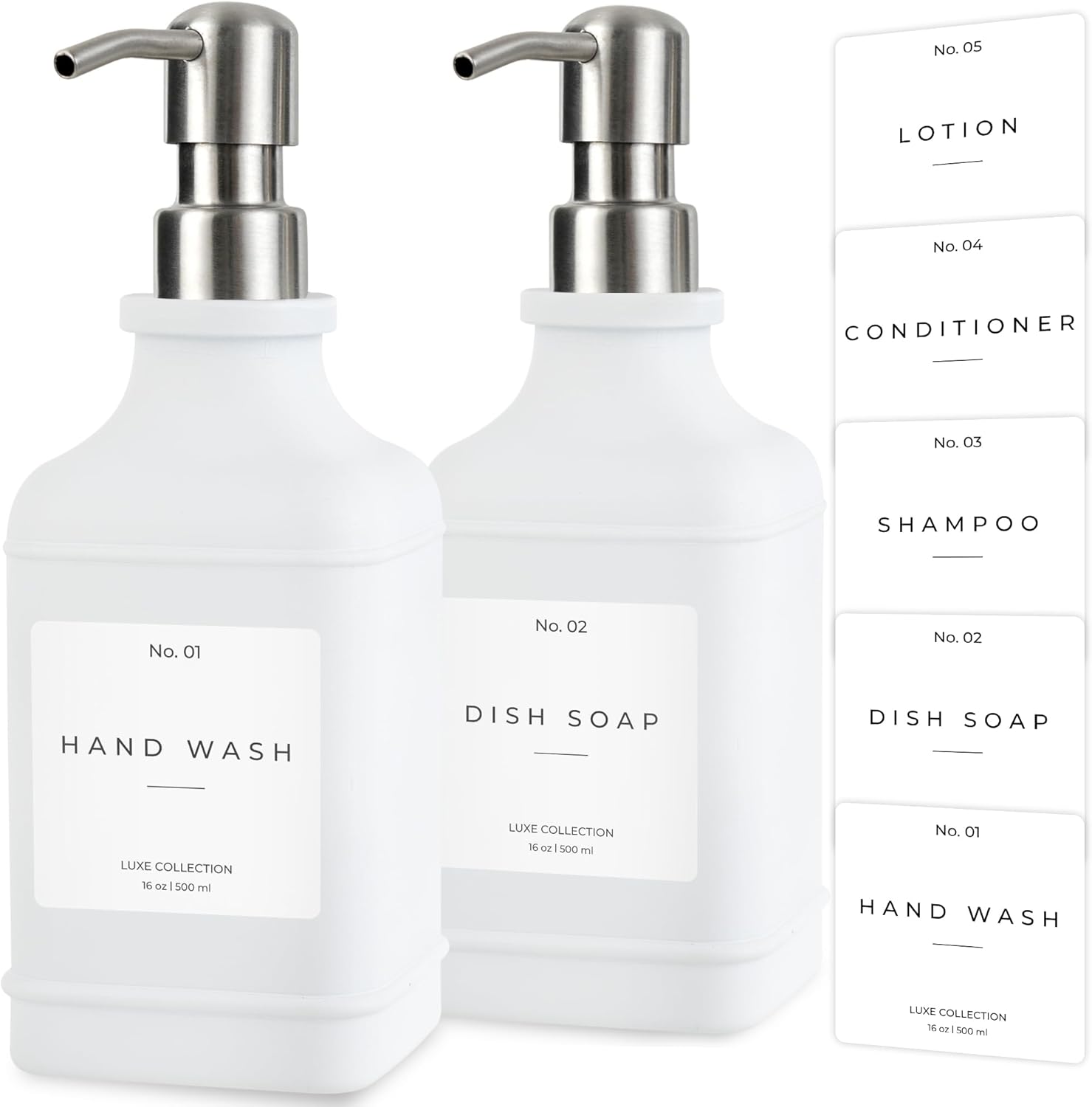 Emerson Essentials Soap Dispenser, Dish Soap Dispenser, Soap Dispenser Bathroom Set, Hand Soap Dispenser, Kitchen Soap Dispenser Set, Glass Soap Dispenser with Pump + Labels | 16 Oz, 2-Pack