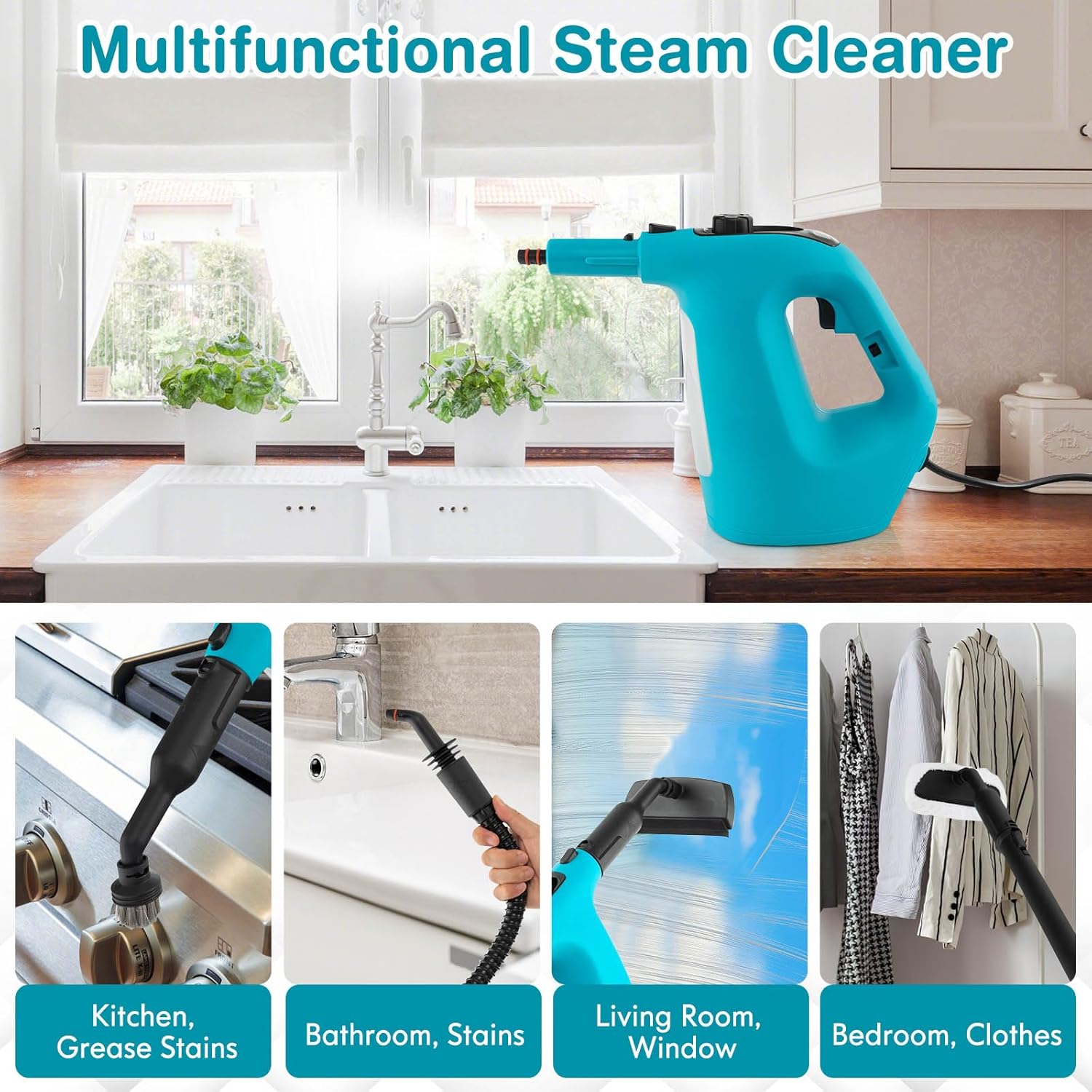 - [Complete Accessory Set]The steam cleaner comes with a complete set of cleaning accessories, including nylon brush, floor brush,big nozzle, funnels, measuring cups, etc.,to meet different cleaning needs.The handheld steamer is great for cars, mattresses, wallpapers, windows, stoves, countertop, sofas and other sealed surfaces such as ceramic, glass, marble, hardwood floors, etc.