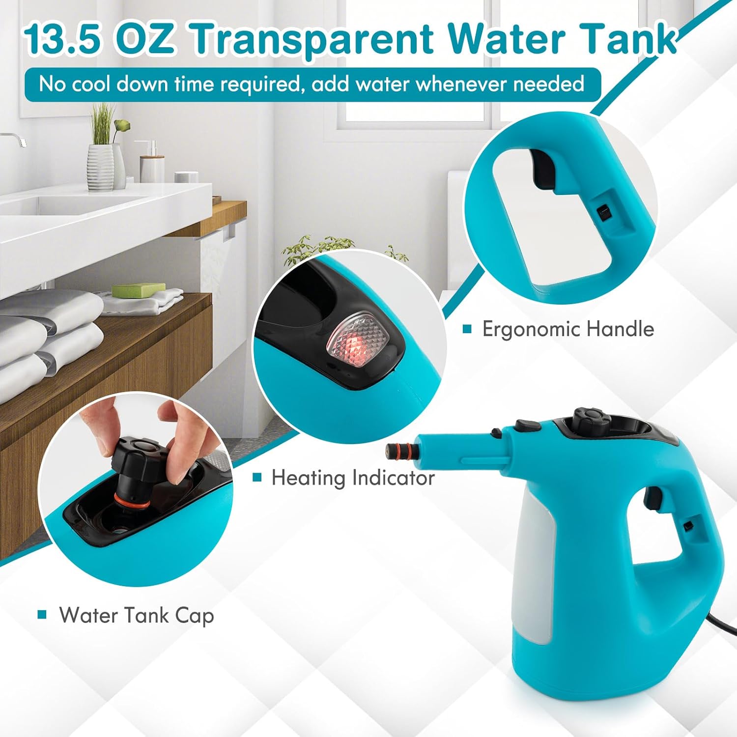 - [350ml Water Tank & Adding Function]This handheld steam cleaner features a large water tank of 350ml, which ensures the steamer runs longer and allows you to concentrate on cleaning.The water level can be observed through the transparent water tank.Once the water is running out, you don’t have to wait for the appliance to cool down or cut off the power, you can directly add water.