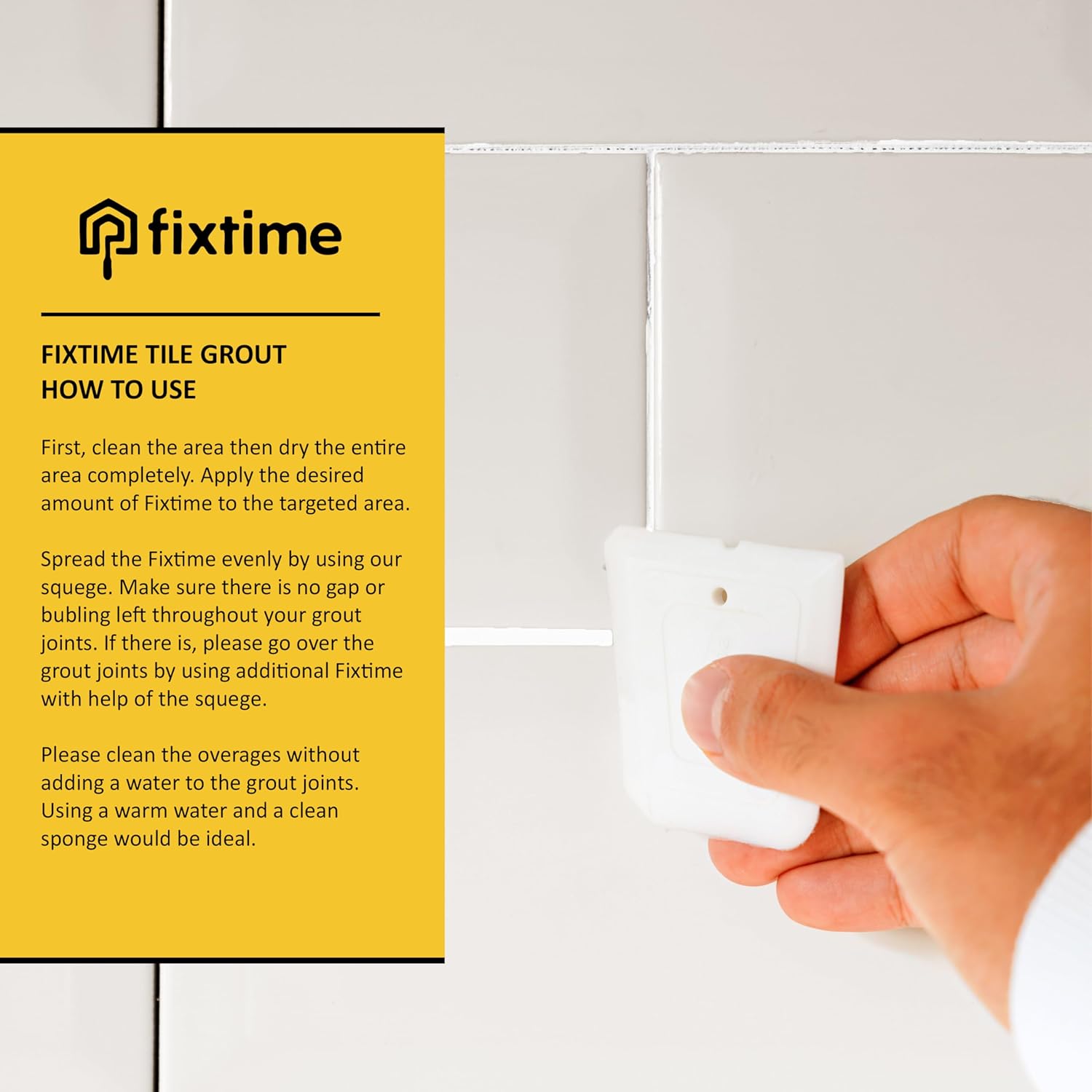- HOW TO USE: First, clean the area then dry the entire area completely. Apply the desired amount of Fixtime to the targeted area. Spread the Fixtime evenly by using our squege. Make sure there is no gap or bubling left throughout your grout joints. If there is, please go over the grout joints by using additional Fixtime with help of the squege. Please clean the overages without adding a water to the grout joints. Using a warm water and a clean sponge would be ideal