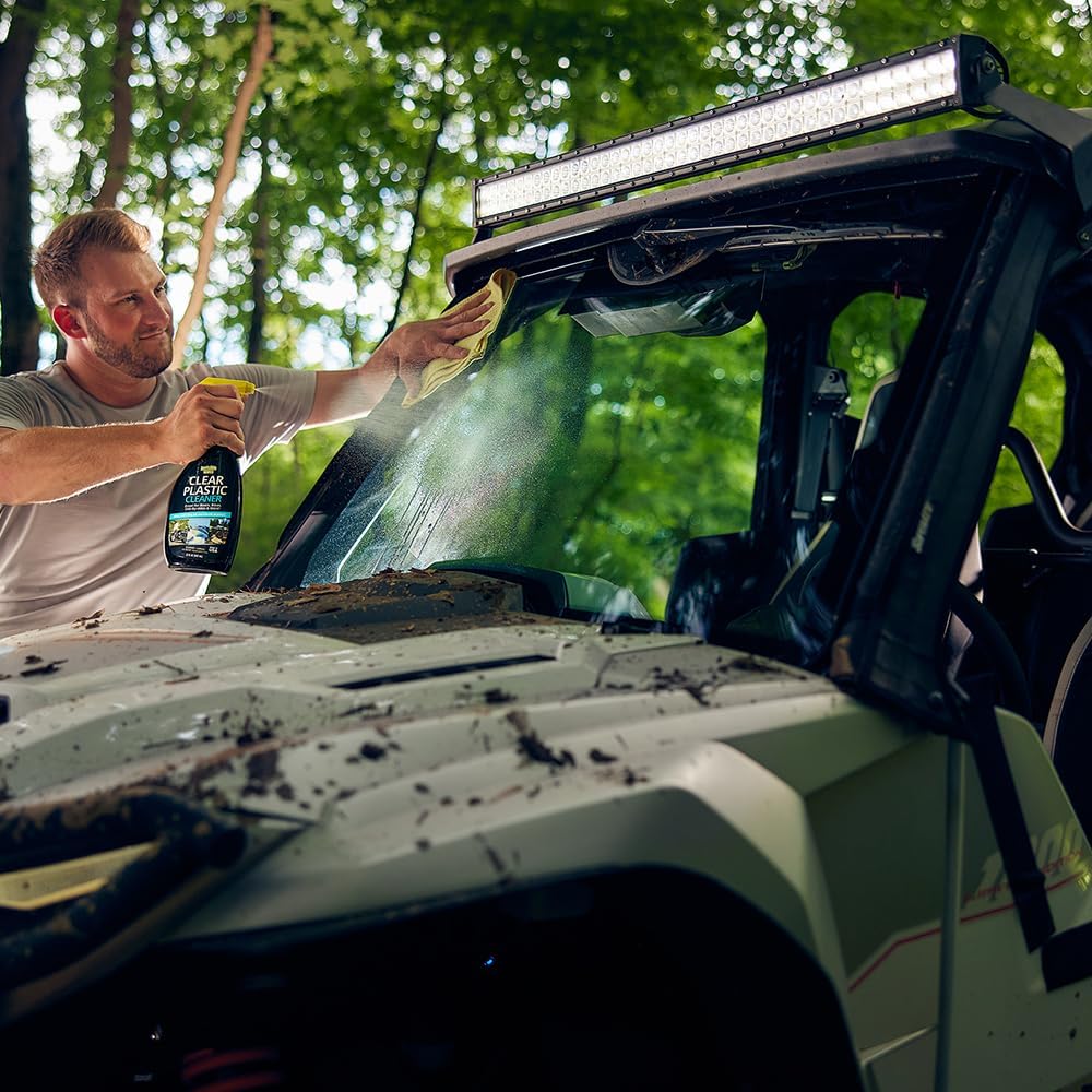 - PLASTIC SURFACE CLEANER: Safely cleans acrylic and vinyl windows, windshields, helmet visors, and more. Leaves no streaks or haze on any clear plastic surface, including aircraft windows, soft-top windows, golf cart windshields, and more.