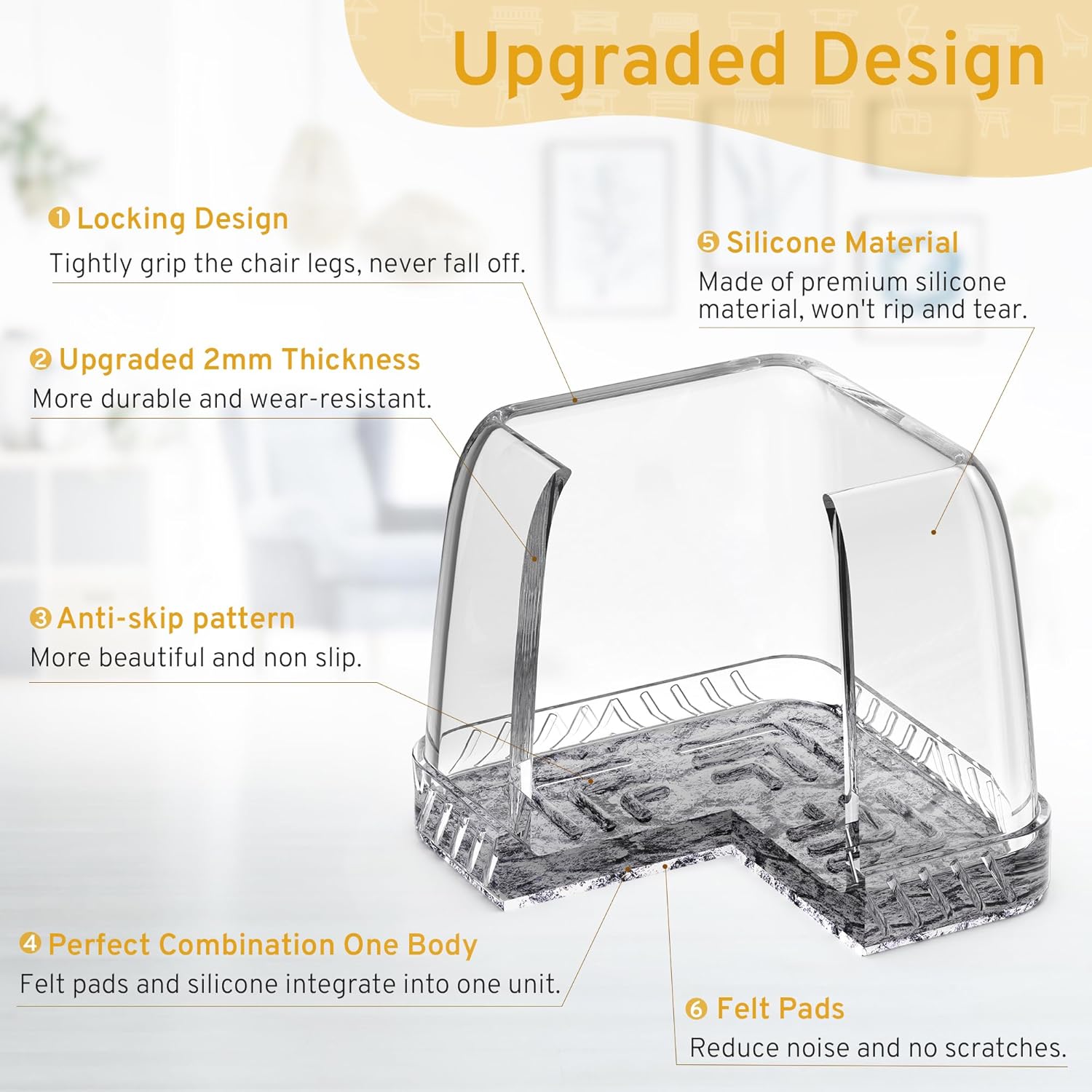 - ✅【Premium Quality Material】We would like to offer top-tier quality chair leg floor protectors at the most reasonable price. So we choose the premium quality silicone material. Our floor protectors for chairs are more clear and have higher thickness than most chair leg covers on the market, which are more durable and flexible, ensuring the floor protectors won't tear when stretched.