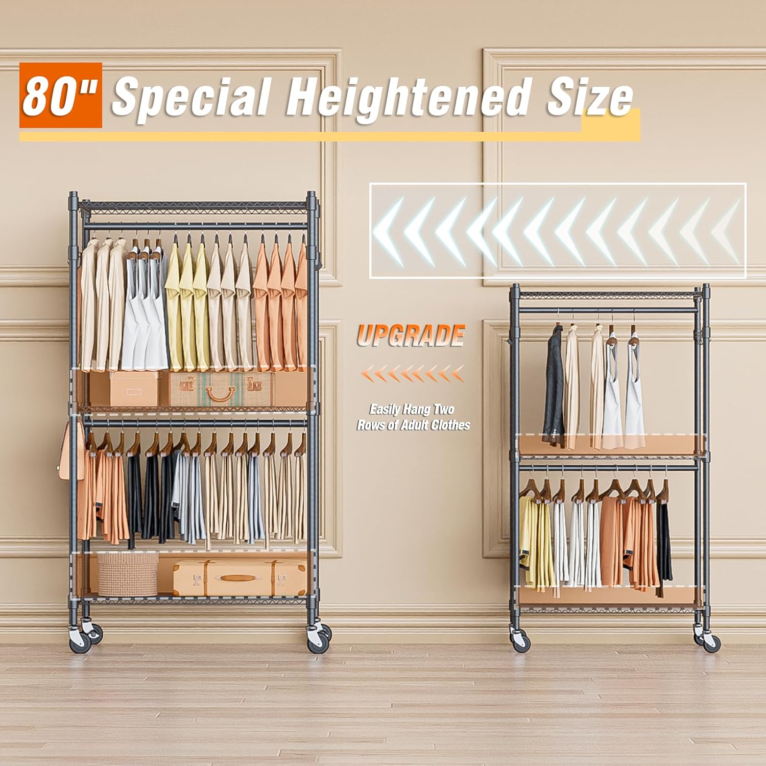 - 【LOCKABLE 360° WHEELS】 Equipped with 4 rolling wheels, 2 of them are locking wheels, designed to allow you to roll this clothing garment rack where ever you need in home. Easy access to bedroom, cloakroom, clothing store, laundry room, walk-in closet and more