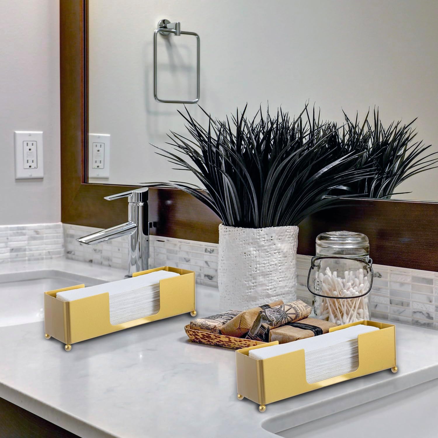 - Modern brass tone metal tabletop paper towel holder dispenser perfect for stylishly storing paper towels in any home, office, restaurant or retail bathroom setting