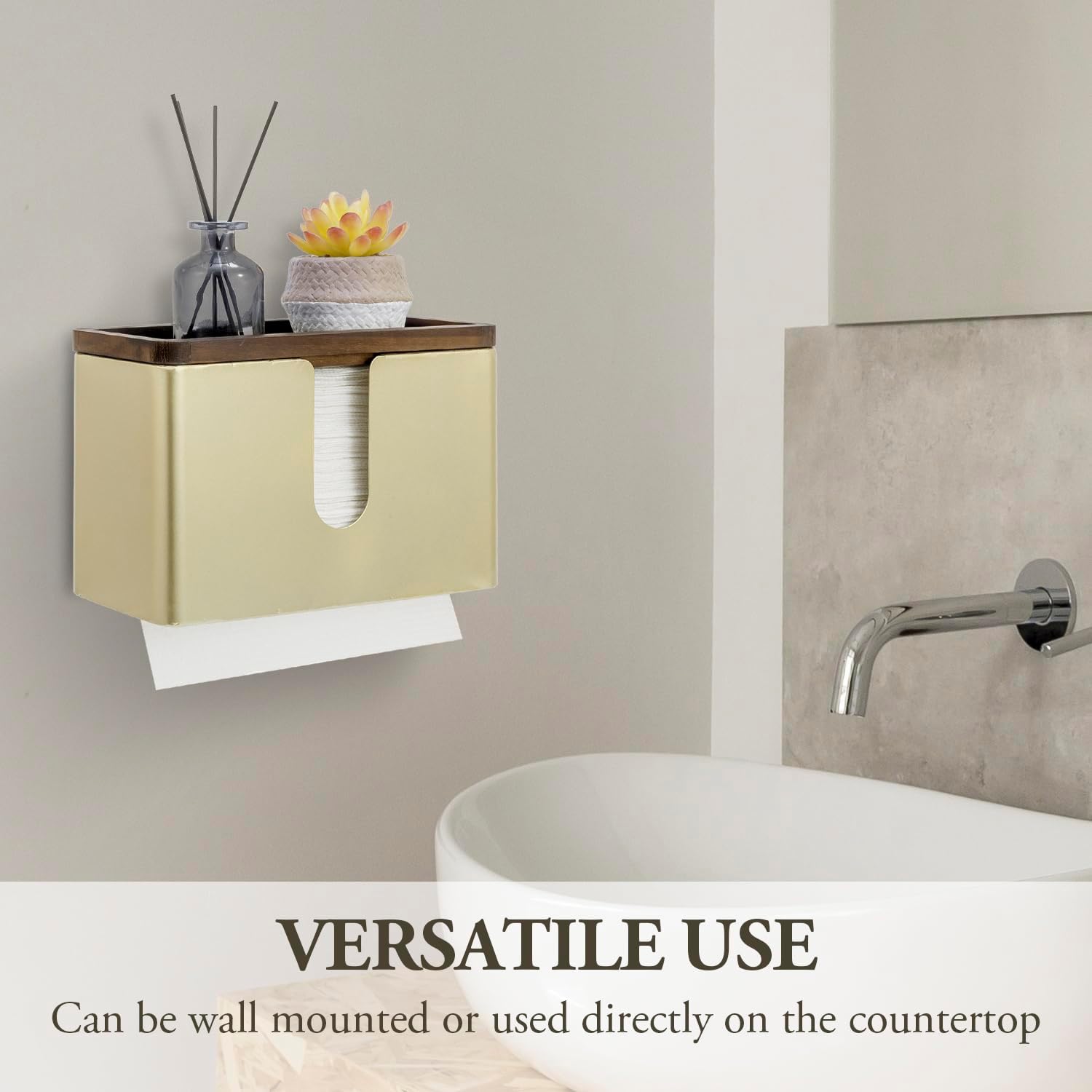 MyGift Deluxe Modern Brass Tone Metal Folded Commercial Paper Towel Holder with Burnt Solid Wood Tray Lid, Wall Mounted Trifold Multifold Z Fold Disposable Napkin Dispenser