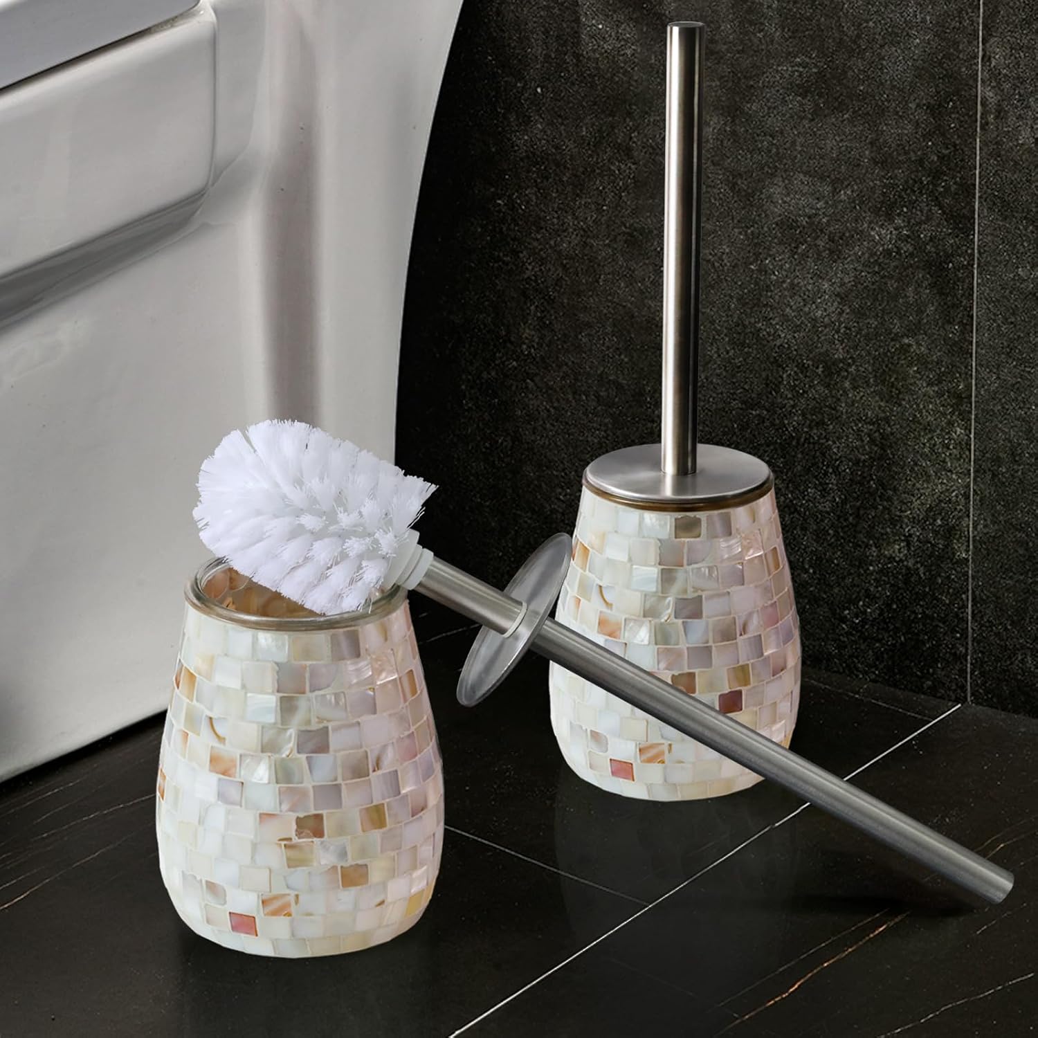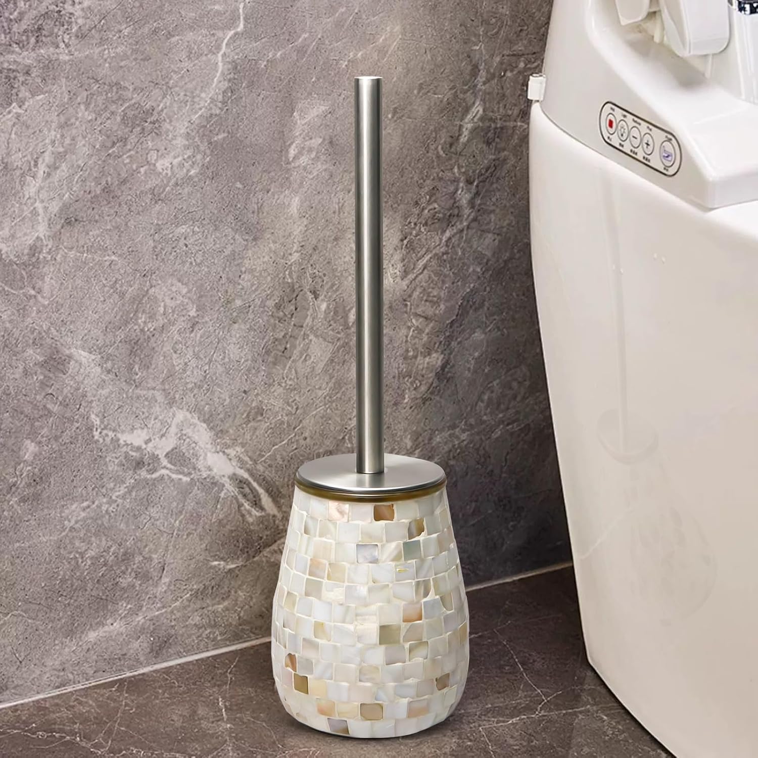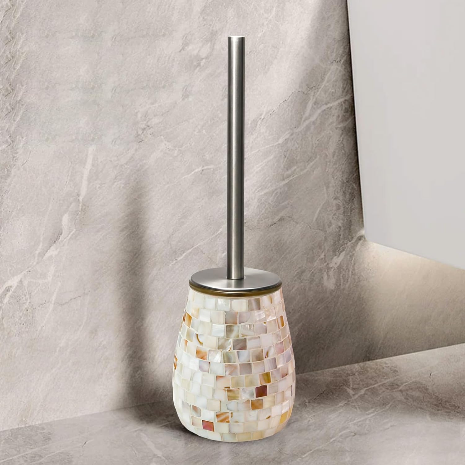 WDHODEC Natural Shell Toilet Brush and Holder Set Mosaic Glass, Stainless Steel Toilet Scrubber Brush, Decorative Toilet Bowl Brush and Holder, Luxury Bathroom Accessories