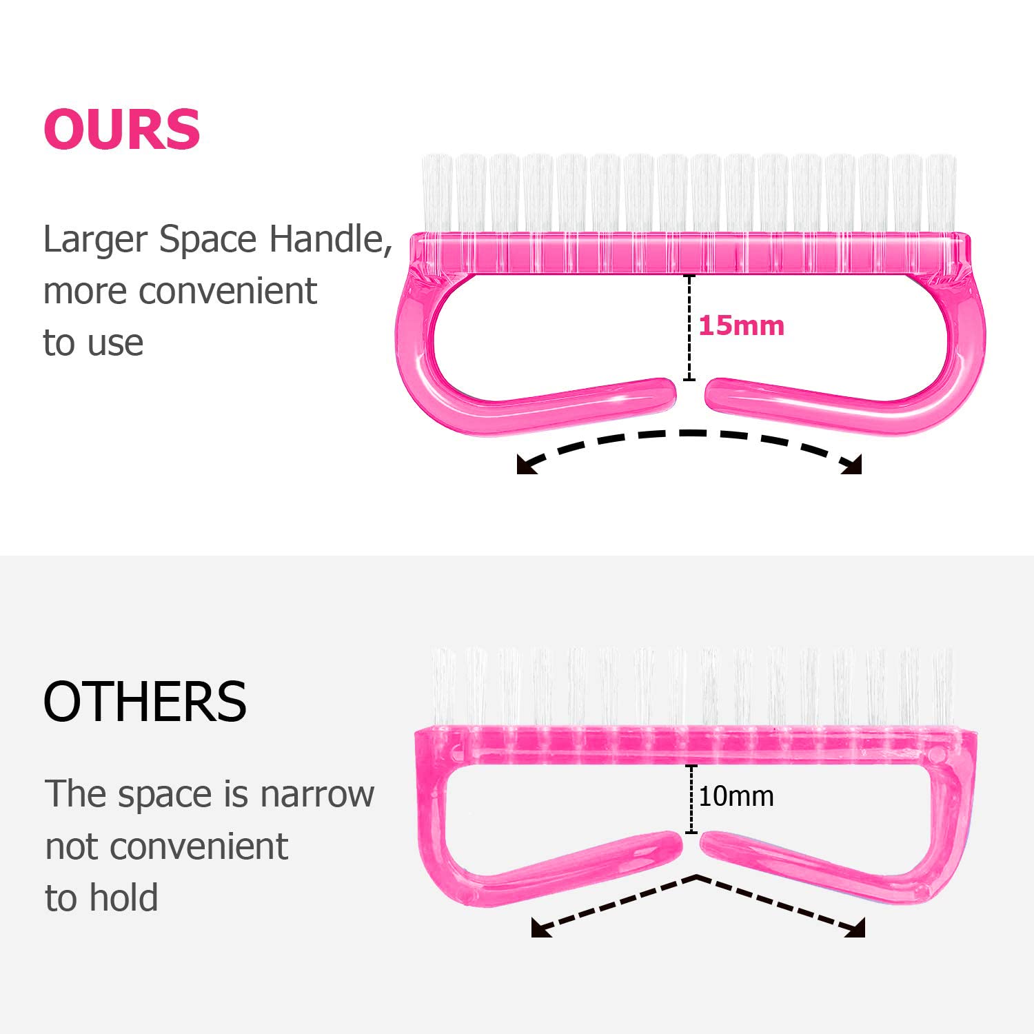 - 【New Design】: We have made some improvements. The Handle fingernail brushes have a larger gripping space, much easier to hold and convenient to use.