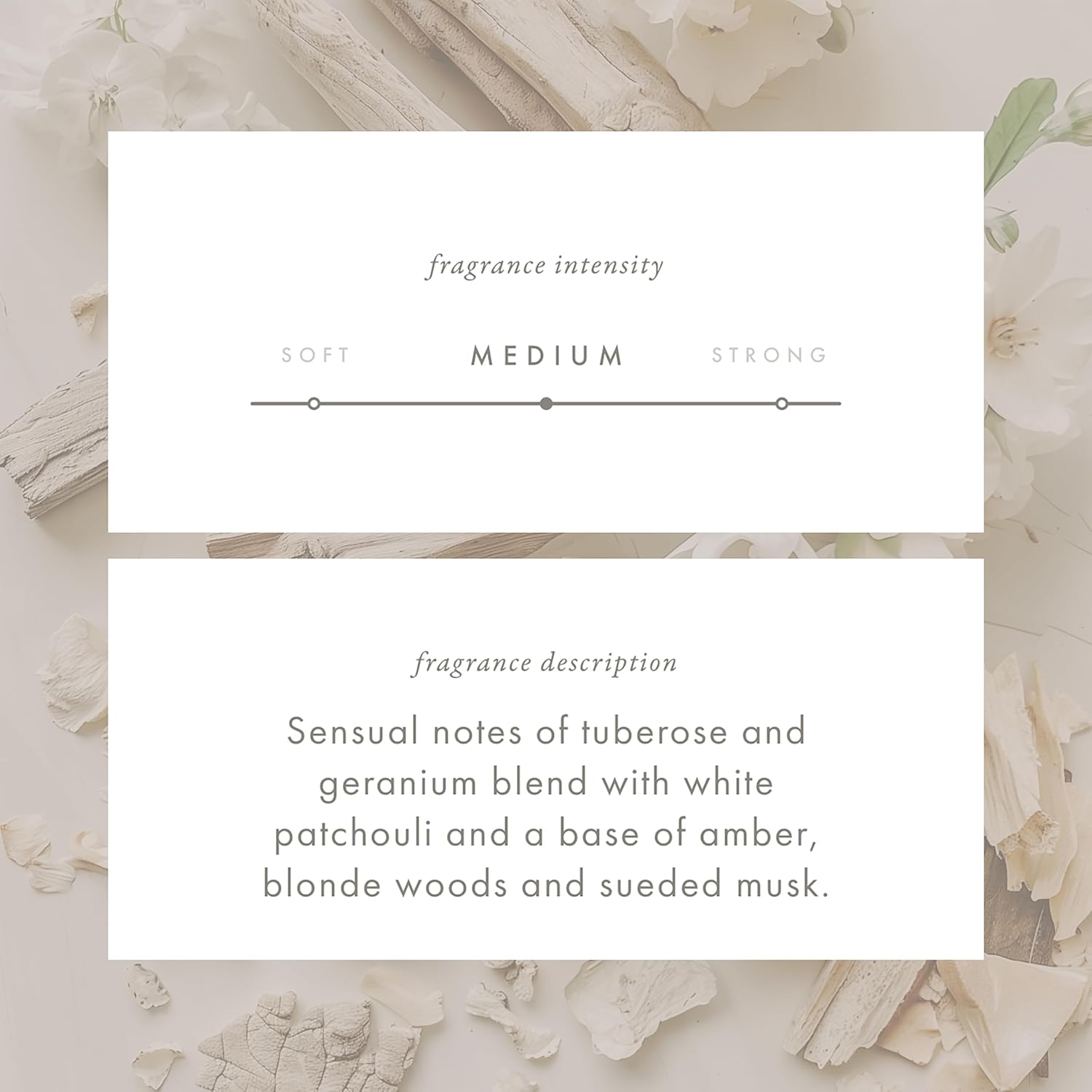 - SMELLS LIKE: Sensual notes of tuberose and geranium blend with white patchouli and a base of amber, blonde woods and sueded musk.