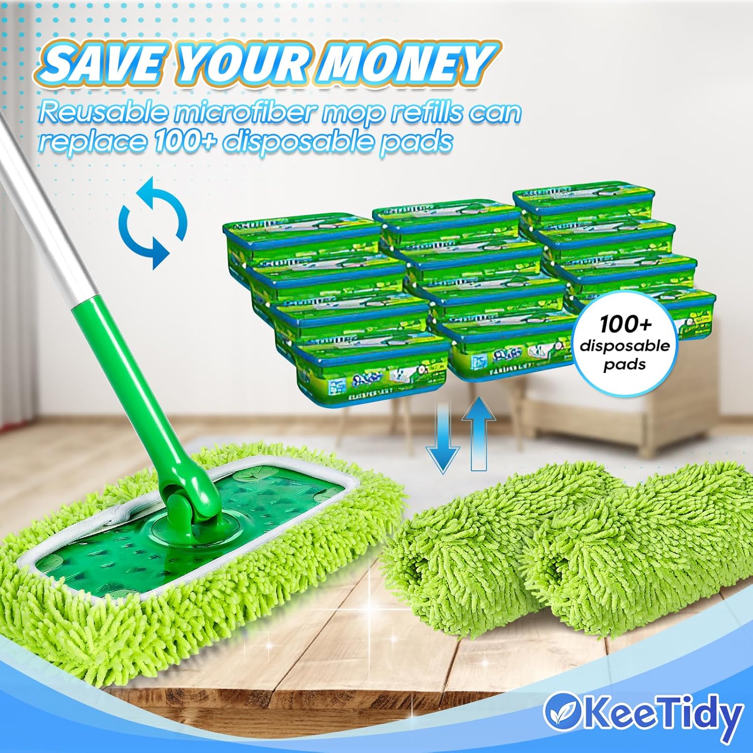- Reusable Mop Pads- These dry sweeping cloths can be washed up to 100 times to replace hundreds of disposable pads, and you can also use your own cleaners instead of those chemical-laden cleaning towels. A greener solution that saves the planet, reduces landfill waste and saves you money. Besides, super absorbent microfiber fabric with wide coverage for mopping will achieve thorough cleaning meanwhile leave no streak or puddle, making your hardwood floor look new again
