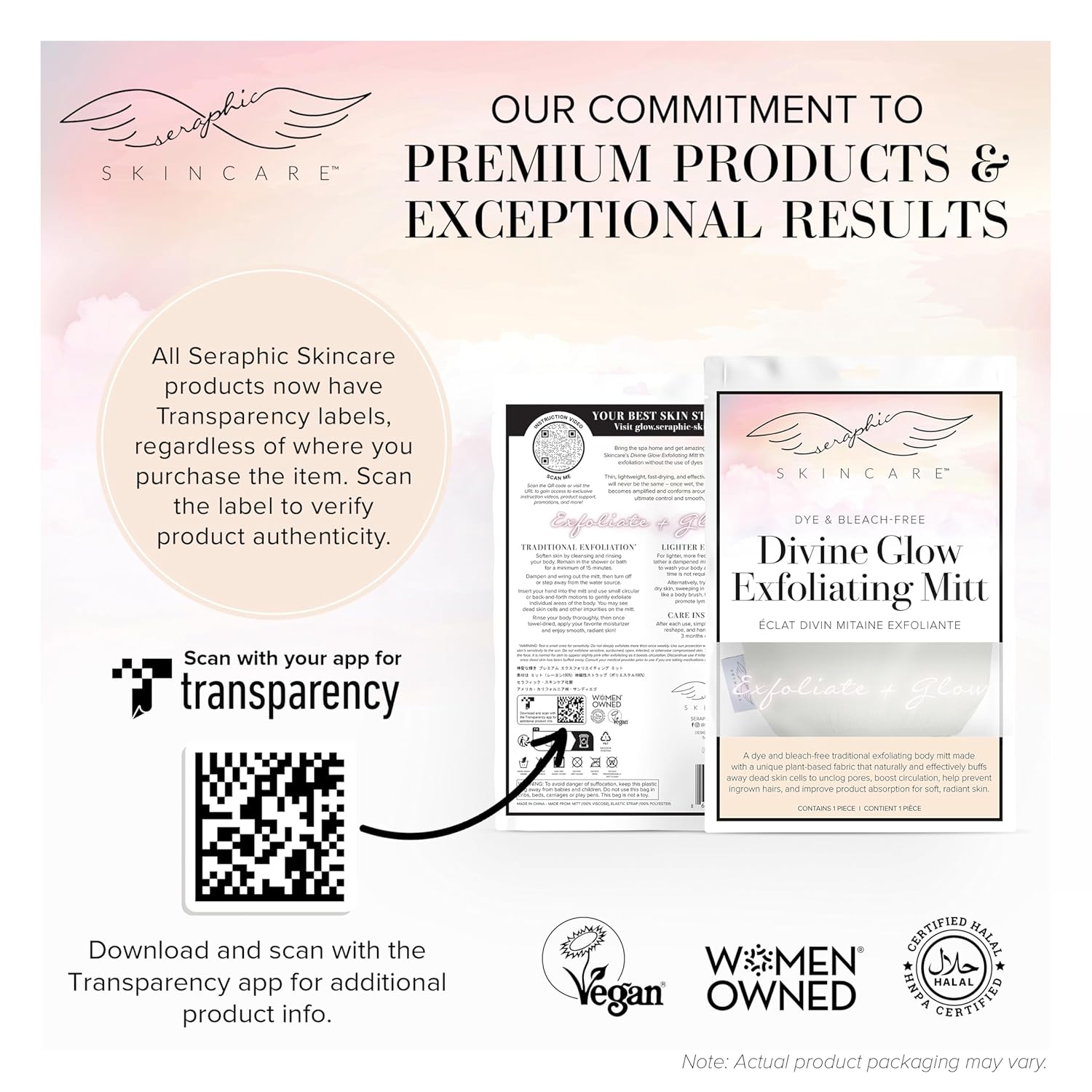 - BETTER THAN LOOFAHS OR CHEMICAL EXFOLIANTS – Loofahs and chemical exfoliants don’t have the skin-gripping power of our Divine Glow exfoliator glove, meaning they’re just not as effective at removing dead skin. Our body mitts are certified vegan and Halal, offering a naturally effective alternative – they’re rough enough to deeply exfoliate while soft enough to buff and smooth. Plus, our product packaging includes step-by-step instructions for customized results!