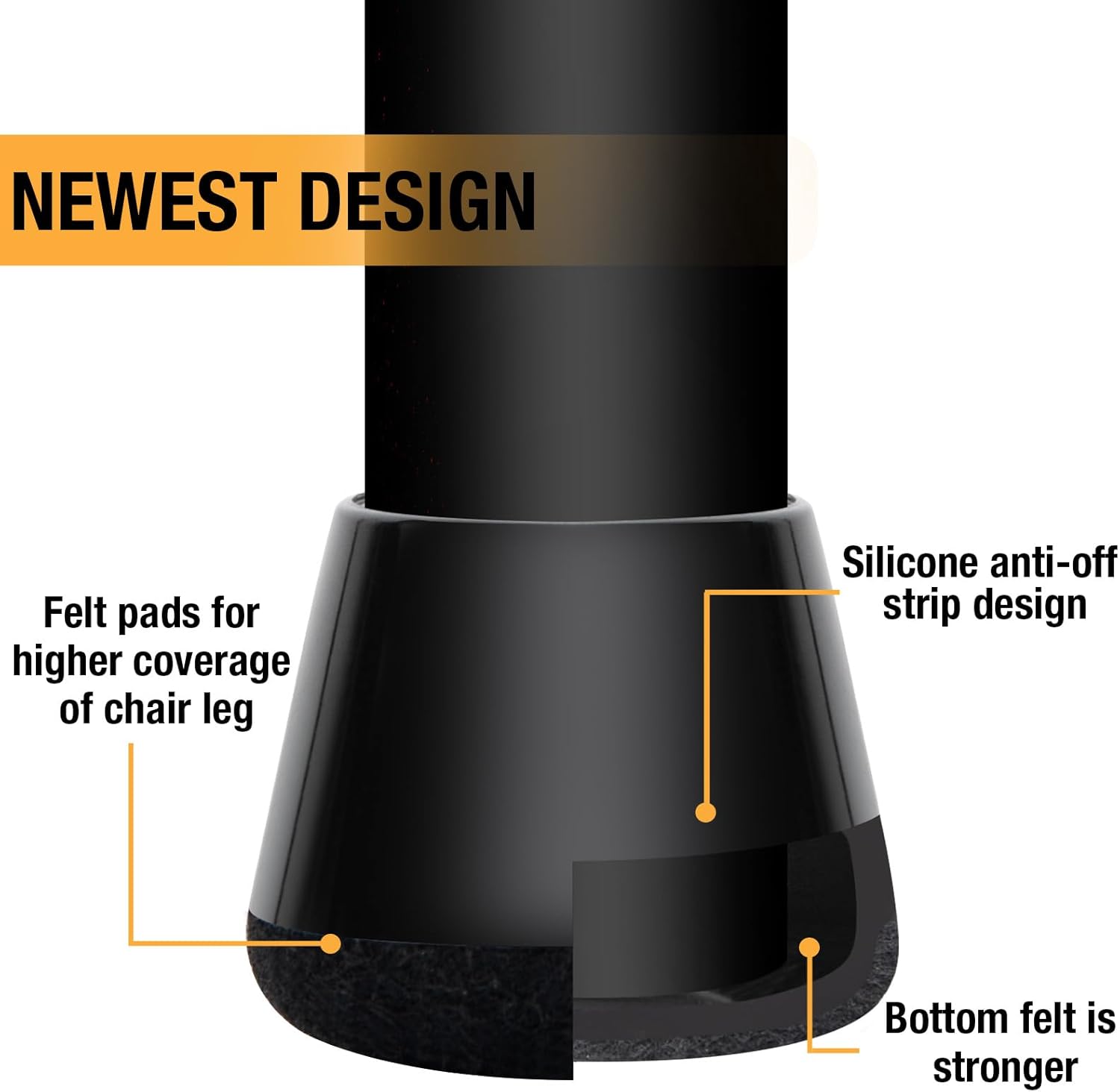 - 【Upgrade New Design】: 360° full felt pad bottom wrapped, which helps the felt bottom be able to touch the floor at any angle, preventing scratching the floor. Our chair leg floor protectors do not use gel. The bottom felt pad and the silicone chair leg floor protectors are integrated with a high-pressure machine to ensure that they will never fall off.