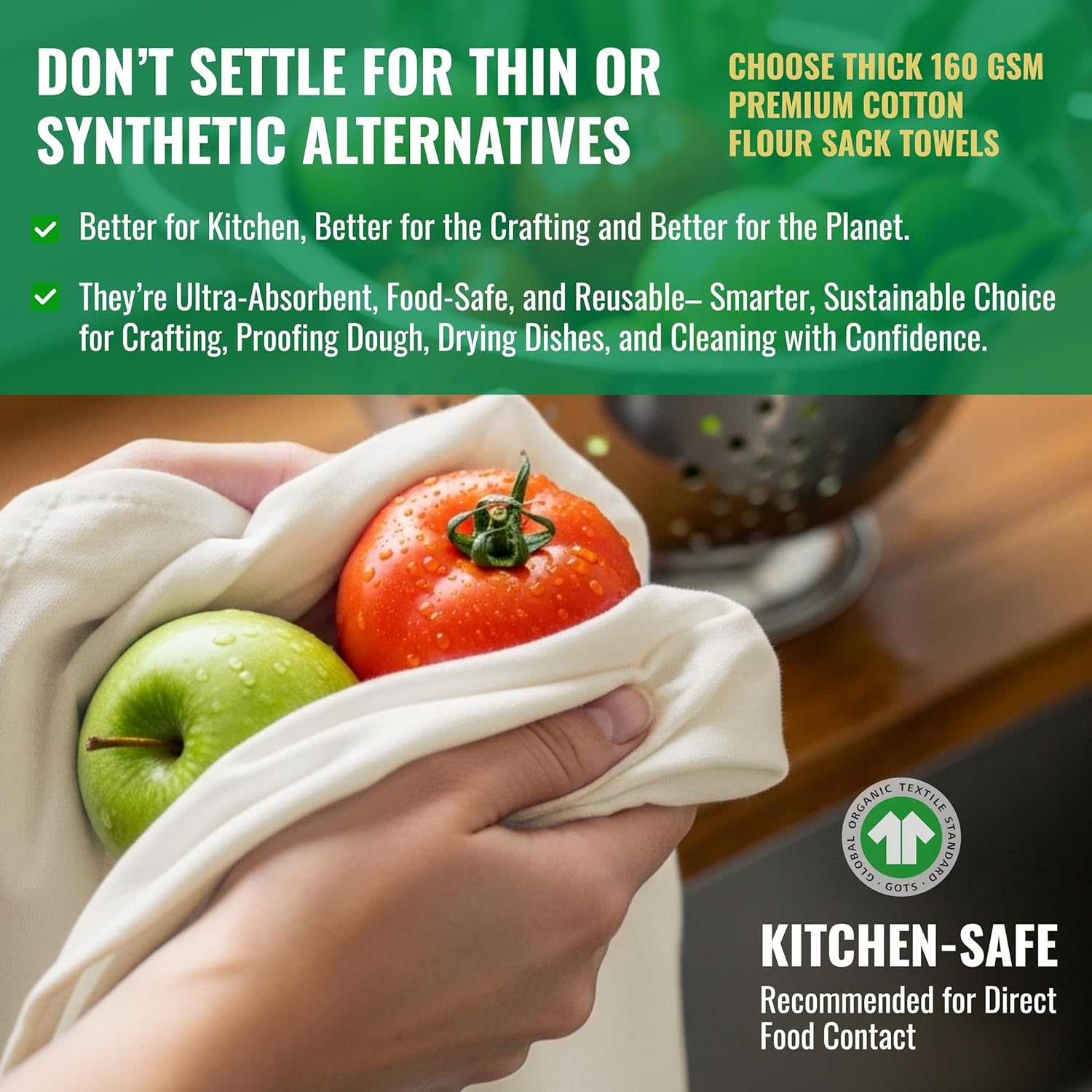 - ✅ 100% Natural Cotton – Safe for Food and Family Use Crafted from unbleached, chemical-free premium cotton, these lint-free towels are perfect for food preparation, and eco-conscious living. An ideal choice for anyone looking for “premium dish towels” or “eco-friendly flour sack towels.”