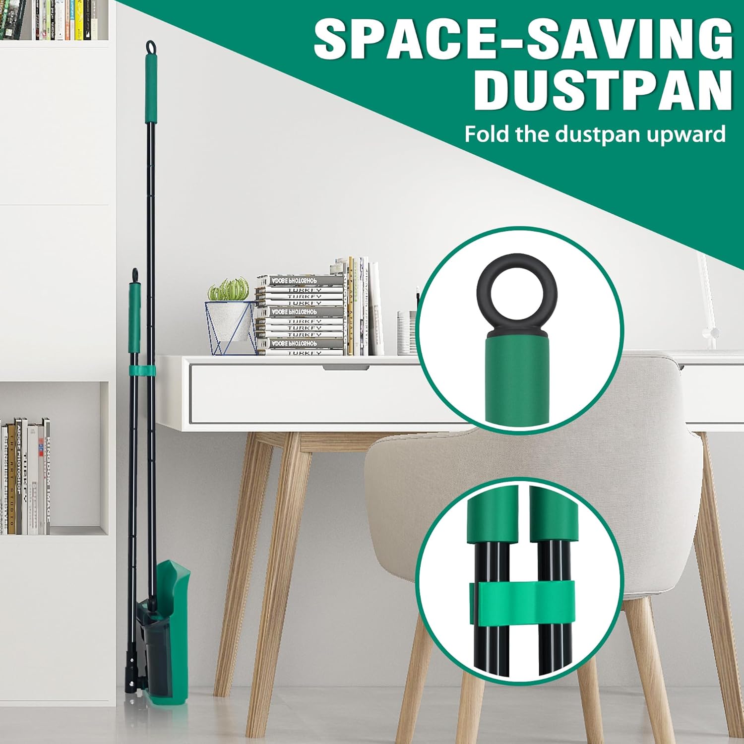 JEHONN Broom and Dust Pan, Upgraded Large Foldable Dustpan with Comb Teeth, 53.5 inches Long Handle Swivel Brush Indoor for Home Kitchen Lobby Floor Cleaning (Green)