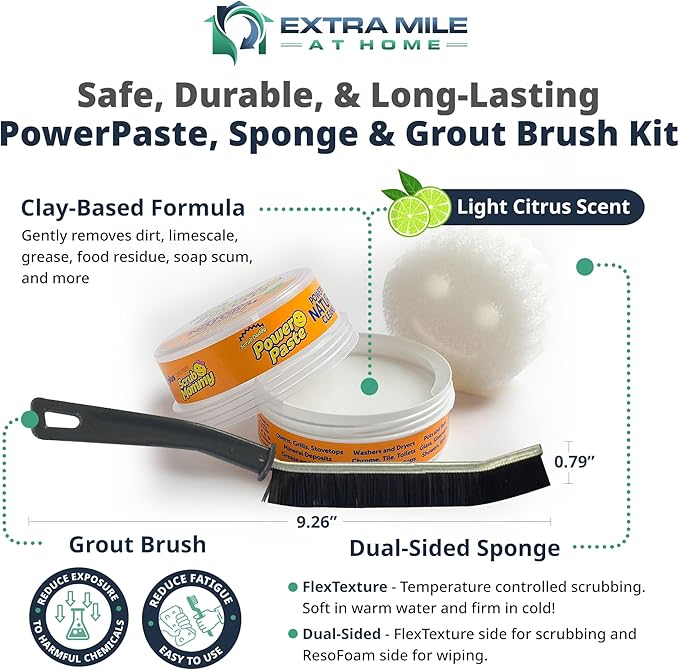 Power Paste Natural All Purpose Cleaner Bundle - Grout Cleaner for Tile Floors with Sponge & Crevice Brush - Deep Cleaning Tools for Shower Tile Grout, Bathroom, Kitchen Surfaces, Tight Spaces at Home