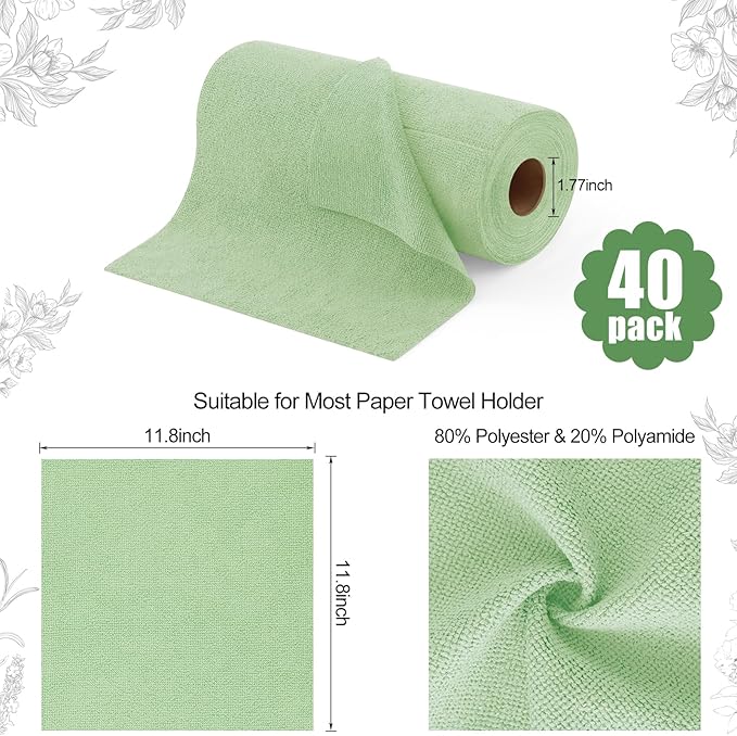 - TEAR-AWAY DESIGN: These tear-away microfiber cleaning cloths are conveniently packaged on a roll, similar to paper towels. With 40 pack of cleaning cloths per roll, you have an ample supply for daily use