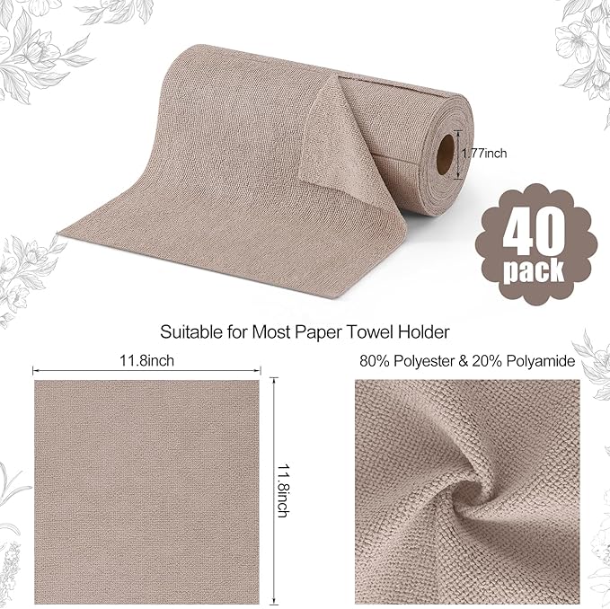 Homaxy Tear Away Dish Cloths Rolls, 40 Sheets-11.8" X 11.8", Reusable Washable Dish Towels for Kitchen, Ultra Absorbent and Quick Drying Microfiber Cleaning Rags, Khaki