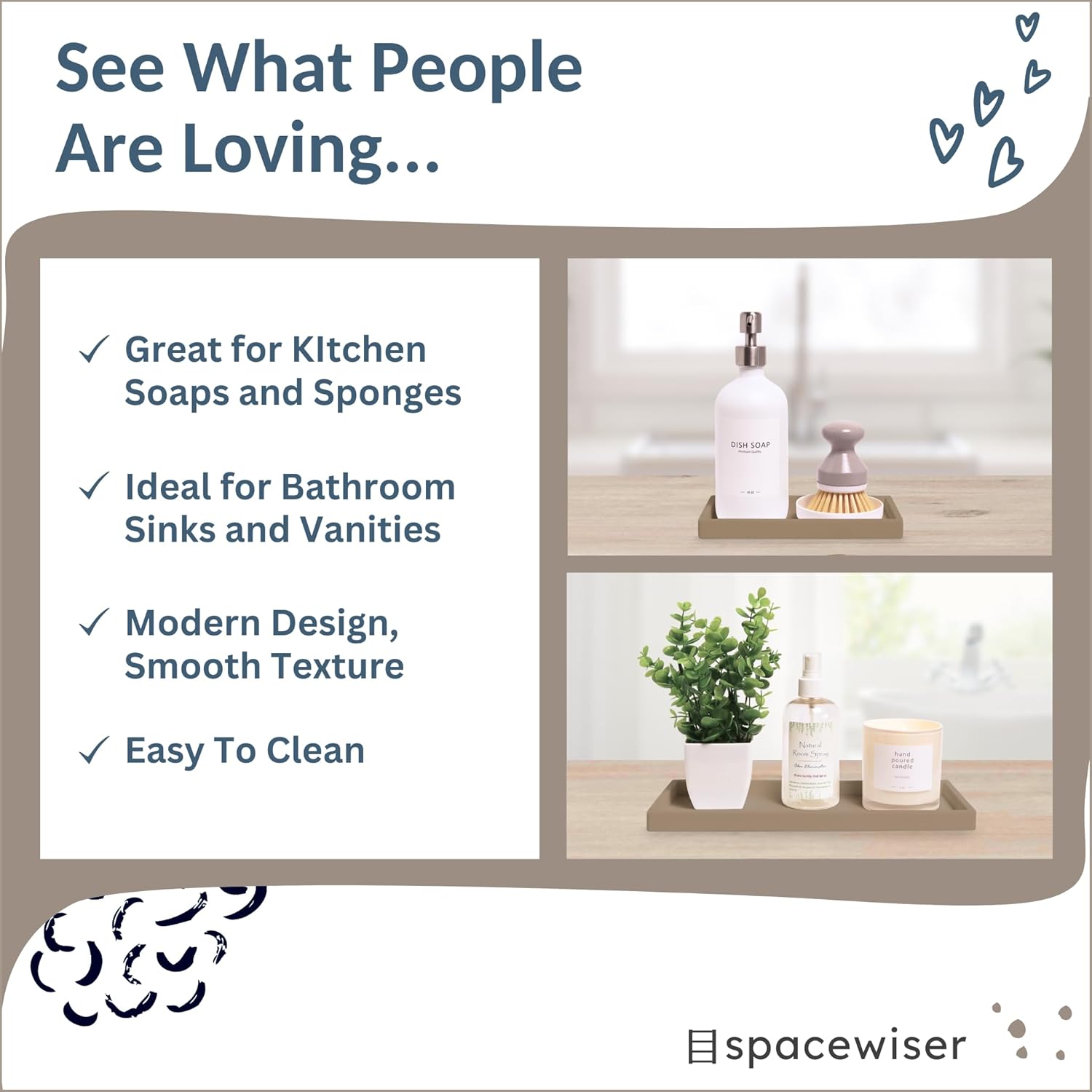 - Use Them Anywhere - Choose the endlessly useful and aesthetically pleasing trays that work anywhere. Spacewiser Original Silicone Trays are made of premium food grade silicone, without the addition of potentially unsafe thickening and hardening agents or chemicals. They’re shatterproof, waterproof, slip-resistant, heat resistant to 425F, and dishwasher safe. They’re the perfect silicone tray for kitchen counter, vanity tray, coastal bathroom tray or kitchen soap tray.