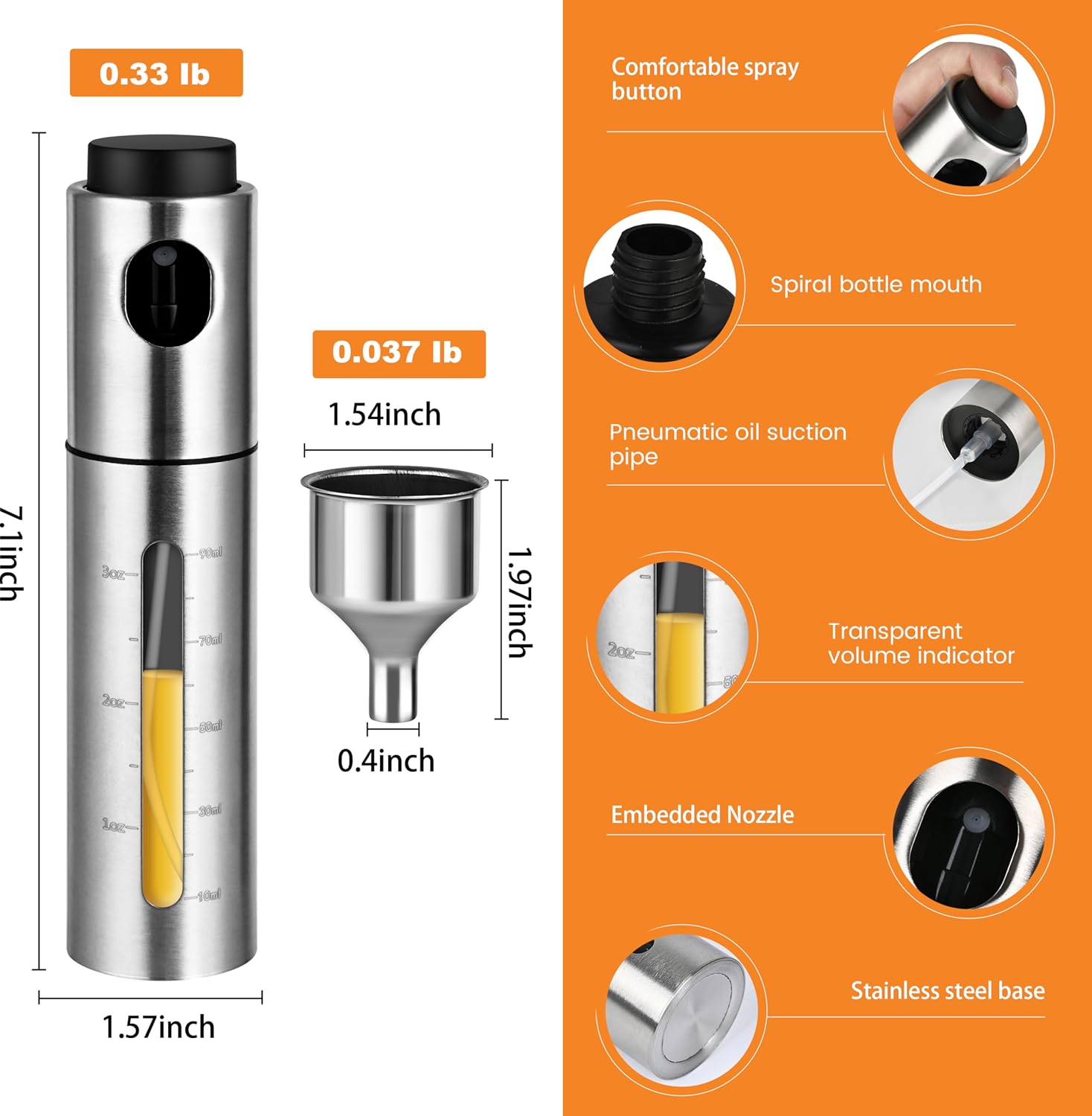 - Package Includes: 2 olive oil spray bottle, 2 stainless steel funnel. For better atomization, don’t fill to the top—leave some space for air pressure.