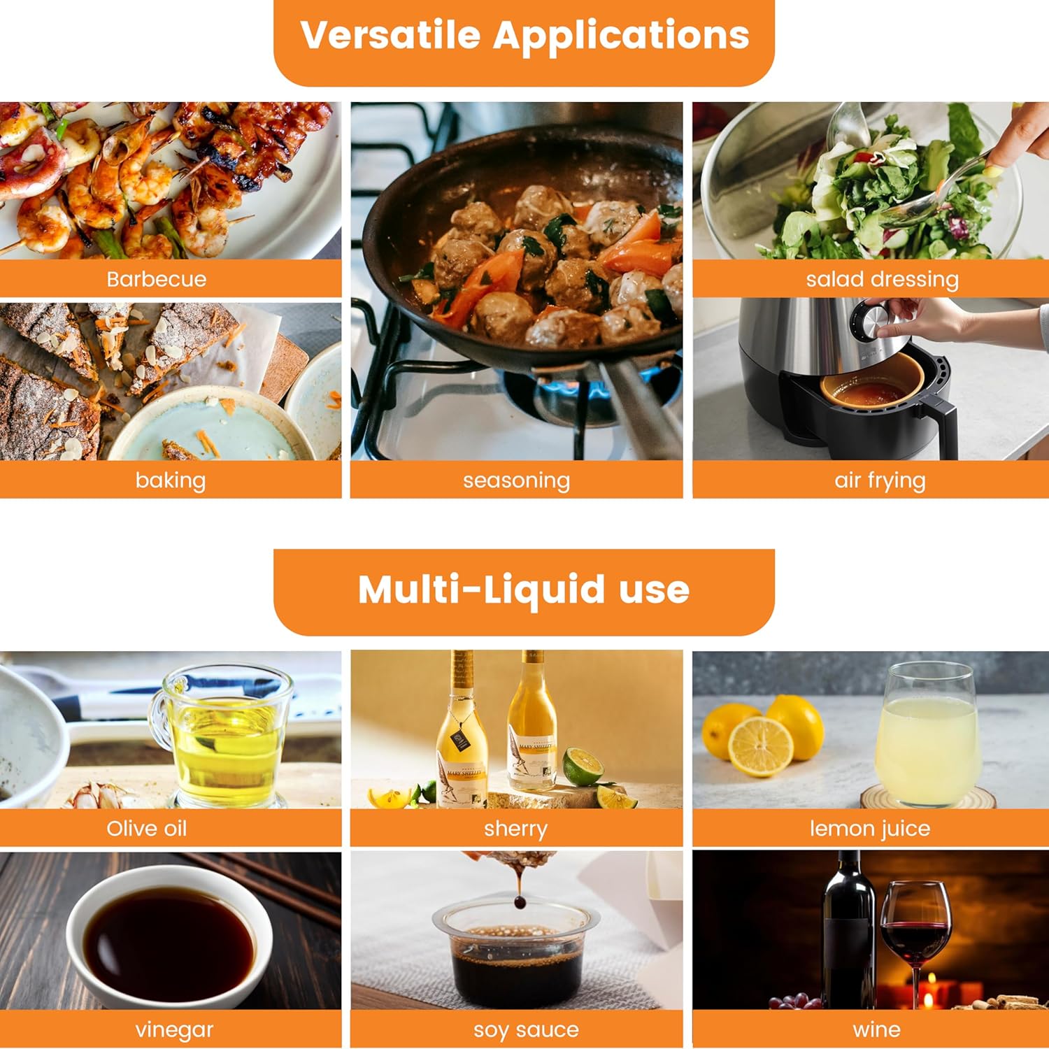 - Multi-Purpose: Perfect for oils, vinegar, lemon juice, sherry, and more. Great for BBQ, baking, seasoning, salads, and air frying.
