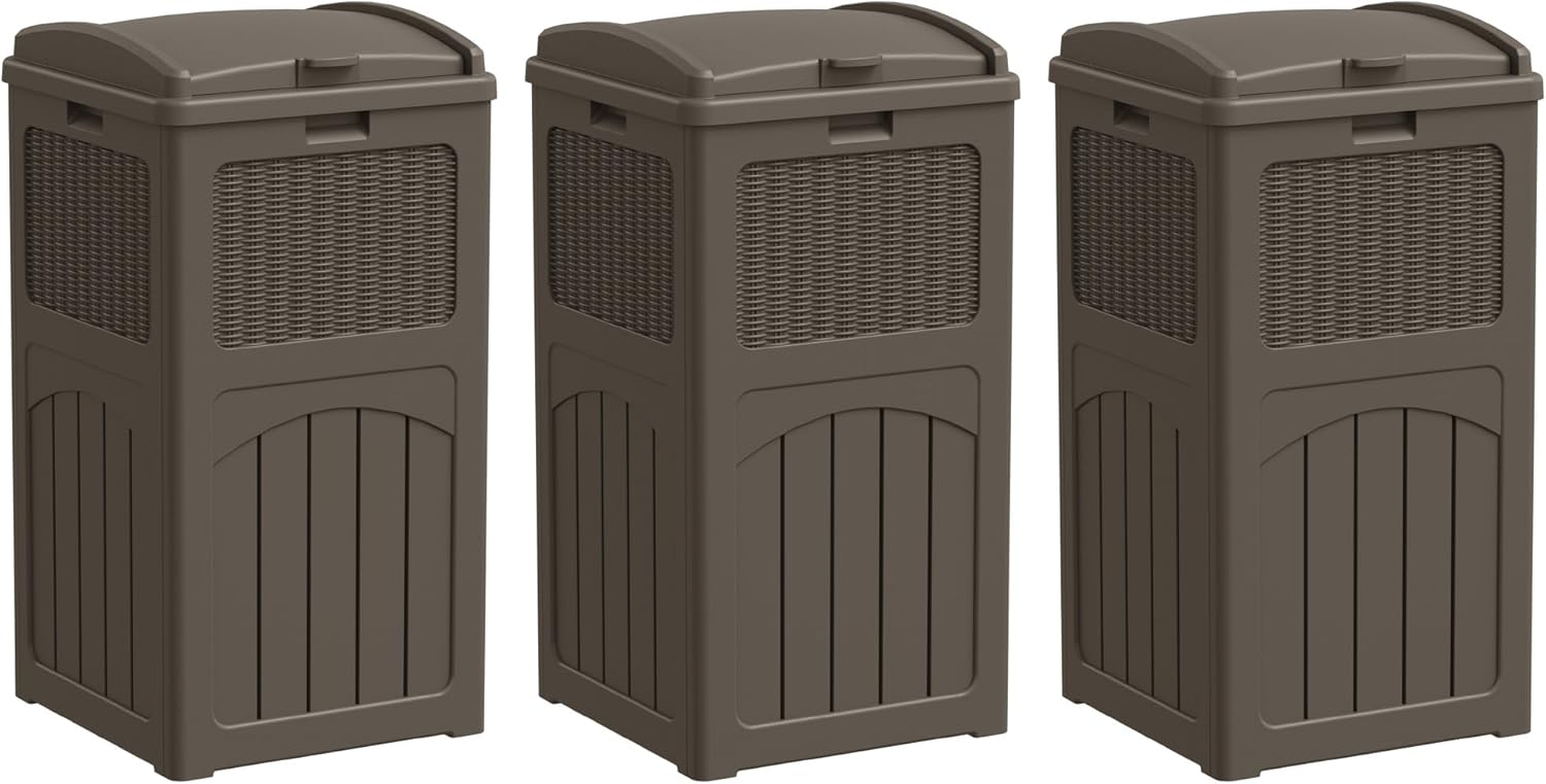Greesum 33 Gallon Outdoor Trash Can with Lid, Waterproof Resin Garbage Bin for Hideaway, Deck, Patio, 3 Pack, Dark Brown