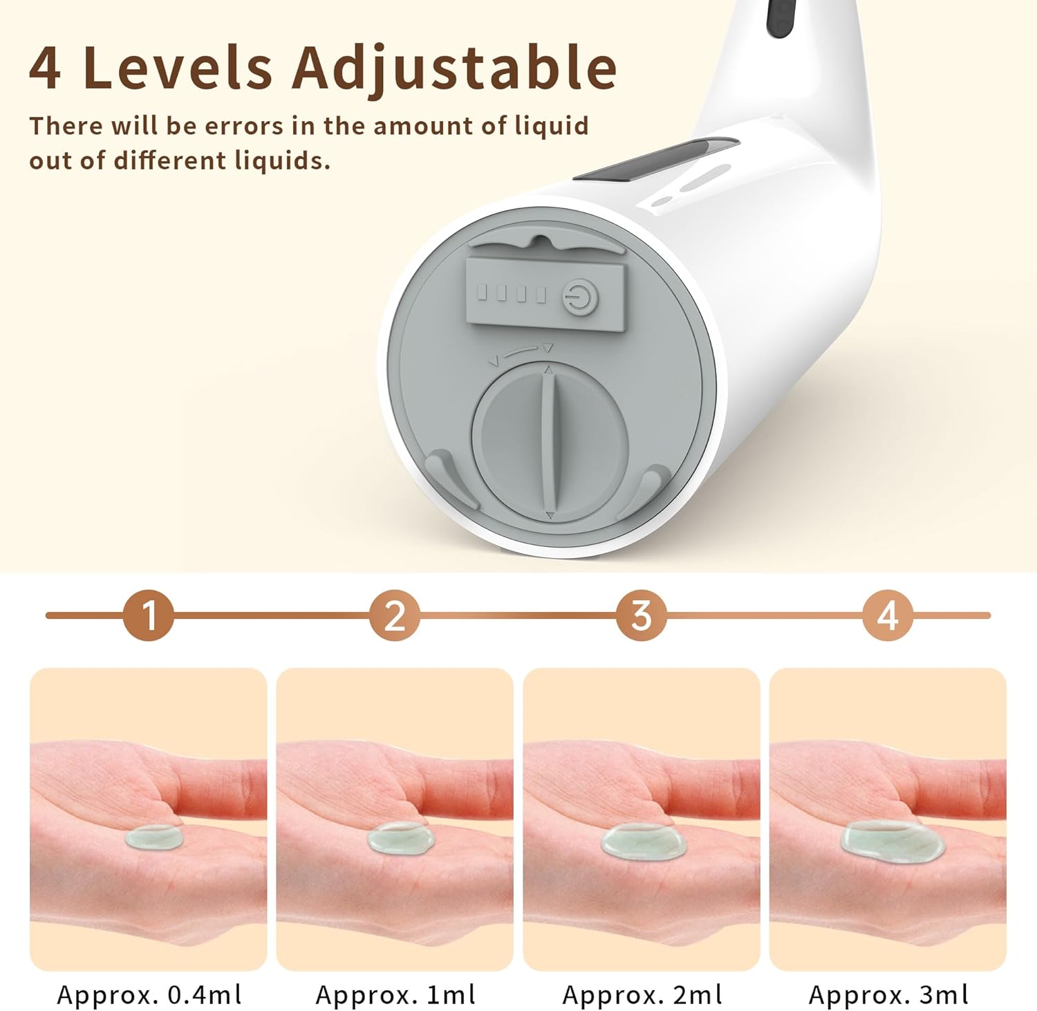 - 【Smart 4-Level Dispensing】This countertop soap dispenser offers 4 precision settings (0.4ml-3ml) - ideal for thick dish soap or light hand sanitizer. The kitchen dish soap dispenser helps reduce liquid waste while providing appropriate portions every time.