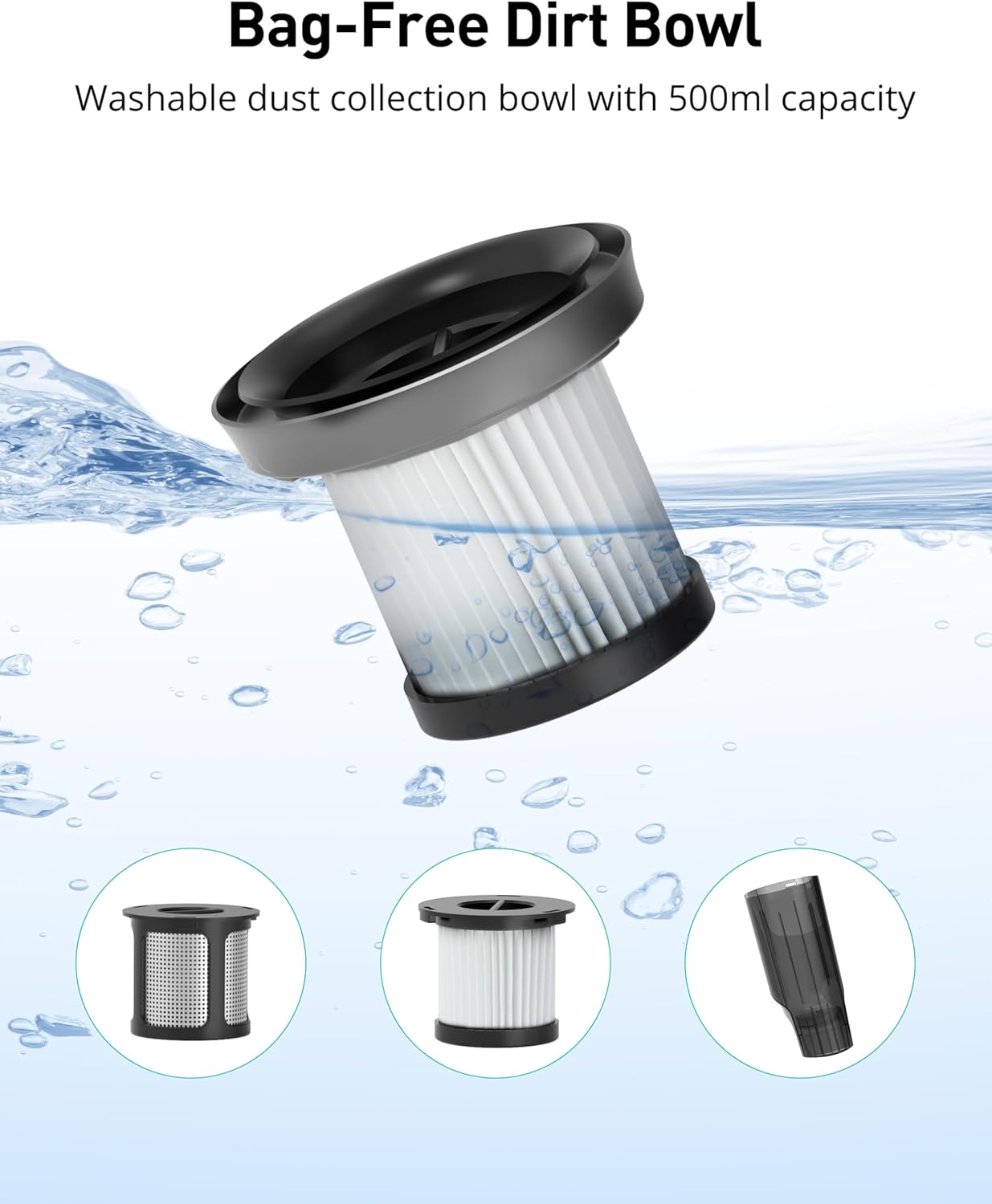 - 【Quick Solution To All Worries】 The 500ml dust collection container offers ample space for debris, while the detachable filter allows for easy cleaning, ensuring optimal performance and longevity of the cordless vacuum, Replacement Filter: B0DLBQPKTN