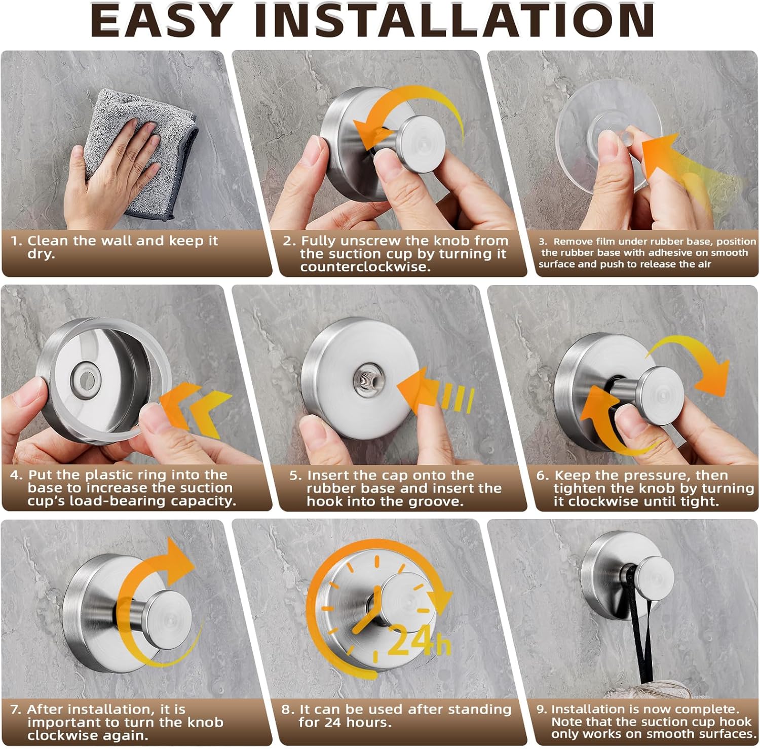 - Wall-Mounted Towel Hooks for Bathroom/ Easy-Install Shower Hooks: Say goodbye to drilling holes! Our towel hooks for bathroom wall mounted utilize advanced vacuum suction technology to attach securely to glass, stainless steel, or polished tiles. Built-in self-adhesive base forms an air-tight vacuum seal on glass, tile, stainless steel and other smooth Non-Porous surfaces – works even in wet bathrooms! Align hook vertically Then press firmly to expel air and lock it.these bathroom suction hooks support umbrellas, coats, flower wreaths, and kitchen supplies - perfect for renters who value reusable and removable storage solutions!