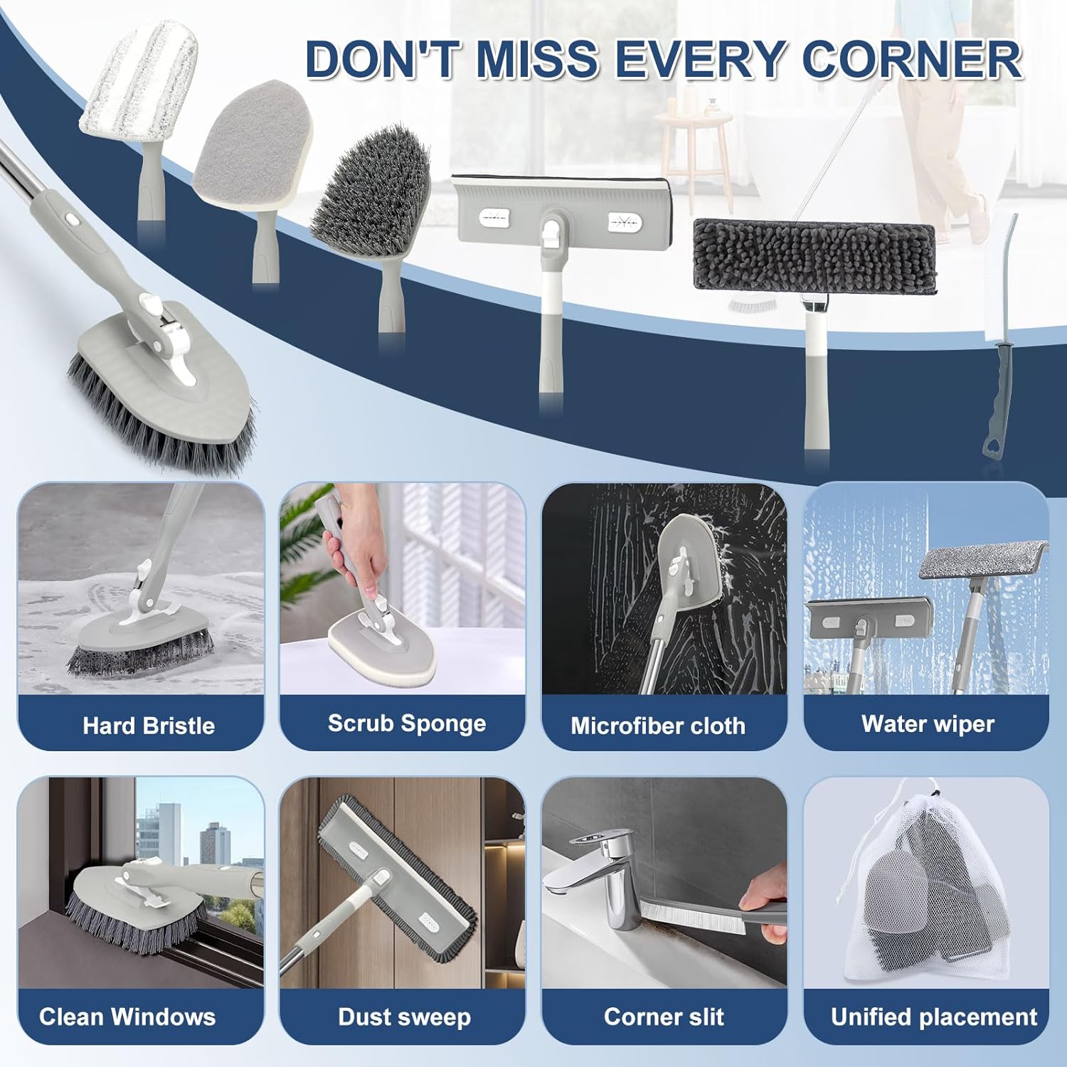 Tile Tub Floor Cleaner Scrubber With Long Handle - 5-in-1 Shower Brush Set for Bathroom, Kitchen, Walls, Sink - Includes Window Scraper and 3 Detachable No Scratch Heads