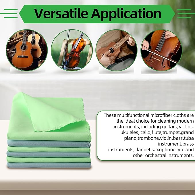 - Versatile Application: These multifunctional microfiber cloths are perfect for cleaning a variety of modern instruments, including guitars, violins, ukuleles, cellos, flutes, trumpets, grand pianos, trombones, basses, tubas, brass instruments, clarinets, saxophones, and other orchestral instruments