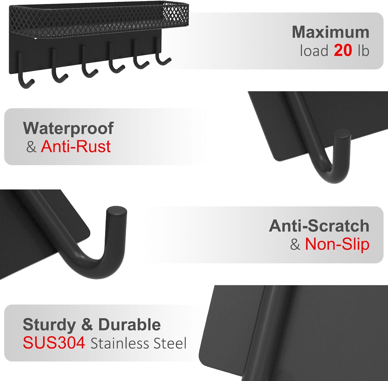 Key Holder for Wall – Decorative Stainless Steel Key Hanger with 6 Hooks for Hats, Bags, Leashes – Mail Holder Key Rack with Mounting Hardware and Guide (9.65” x 2.8” x 2.2”) (Black)