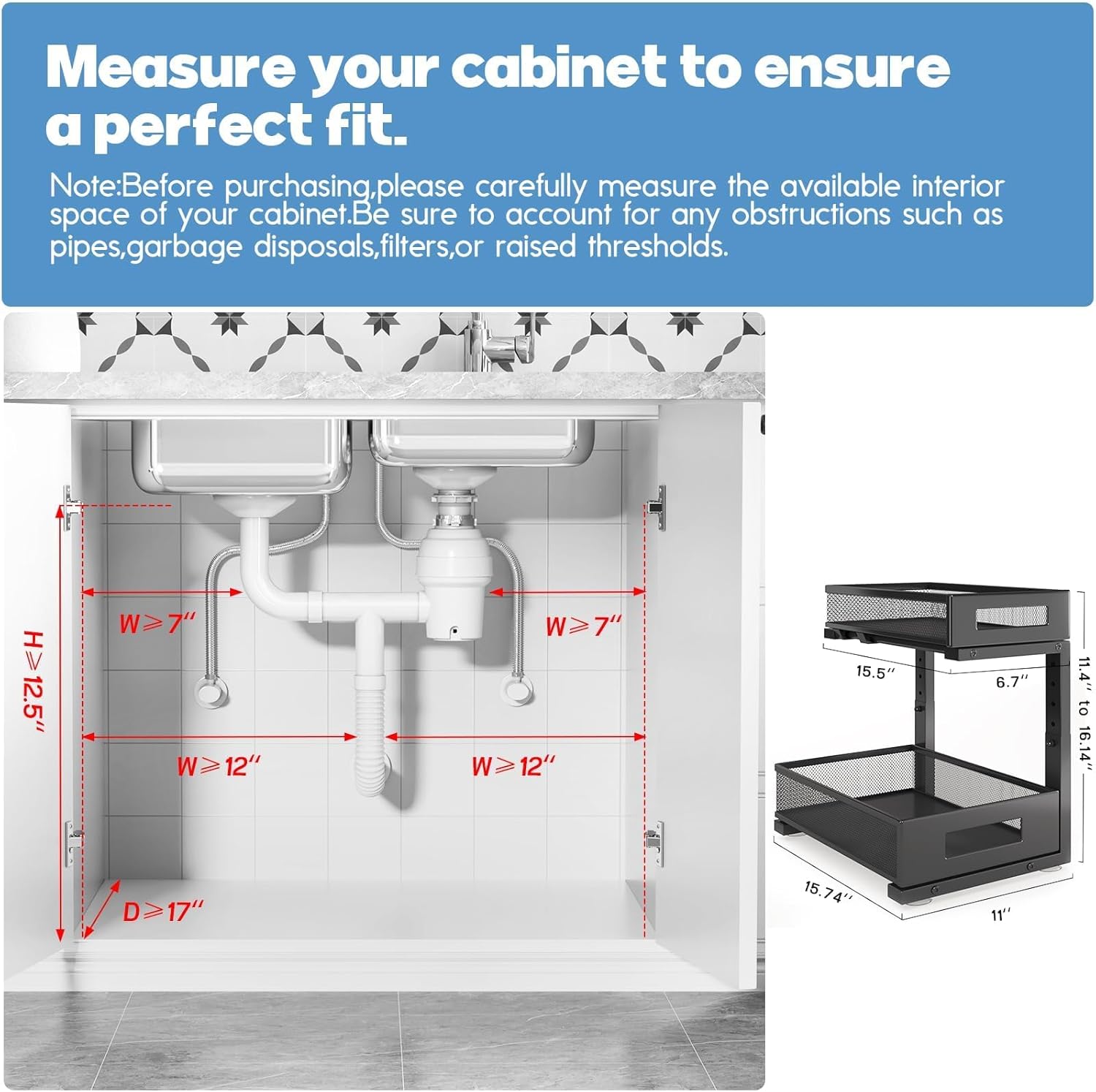 - 【Maximize Your Space】This organizer features an L-shaped design and 5-level adjustable height to optimize under-sink storage. The narrow top and wide bottom layout avoid pipes and garbage disposal, while providing ample space below for tall bottles. The 5-level height adjustment (11.4-16.14 inches) allows easy customization, adapting to complex pipe setups and ensuring efficient storage for items of various heights, maximizing vertical space and enhancing organization.