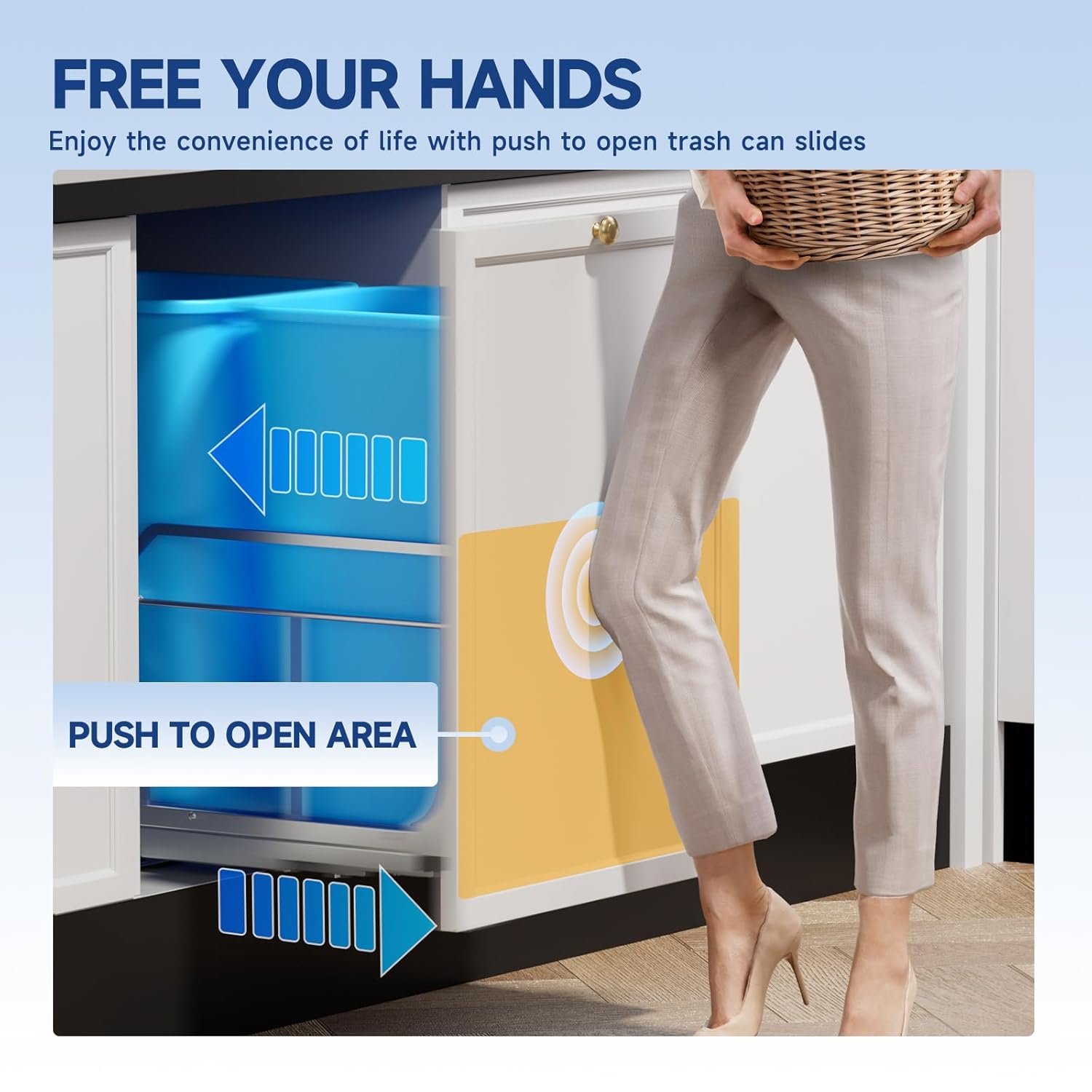 - Push To Open Function: Under cabinet trash can pull out feature a push to open release mechanism, simply press the cabinet door gently and it automatically pops open, freeing up your hands when you're busy cooking or lifting, and eliminating the need to bend over to open and close cabinets, just touch the door with your knee