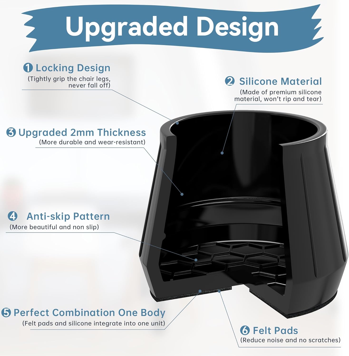 - ✅【Comprehensive Improvement】The chair leg floor protectors use special technology to combine the felt and silicone into one inseparable piece, which prevent the felt pad from falling off during use. We chose the premium quality silicone material which bonds the felt pad better, and won't tear easily when stretched.