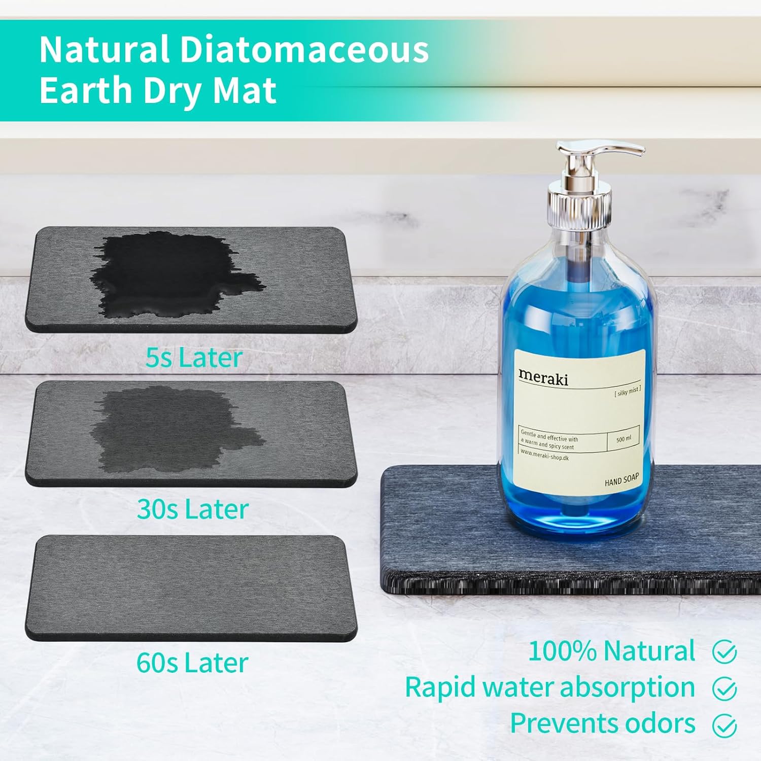 - [Instant Dry Sink Caddy]: The bottom of our sponge holder is made of diatomaceous earth absorbent mat, which automatically absorbs water and dries in 60 seconds, no longer need to manually pour water.The mat is removable, so you can remove it for cleaning