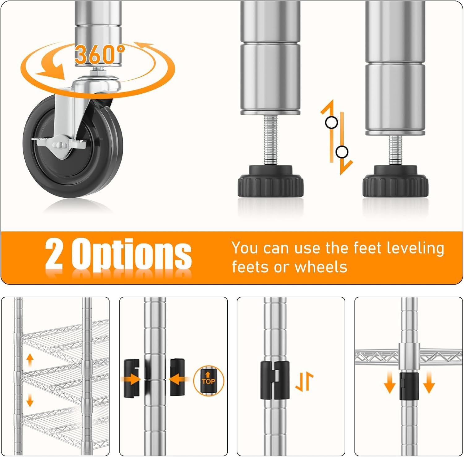 - 【ADJUSTABLE HEIGHT】Each layer of the wire shelf can be adjusted to match the height of your items, optimizing your storage space. Additionally, you can join two storage racks to form a wider unit, providing extra width to meet your needs. No matter your requirements, you can assemble a shelf configuration that fits just right