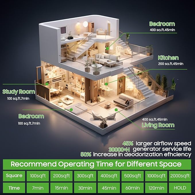 - 【High Capacity Ozone Machine】Upgraded high capacity ozone generator, it has max output 100,000mg/h, ozone machine odor can cover up to 7,000 square feet of space. And it's made of metal which makes it elegant and sturdy.