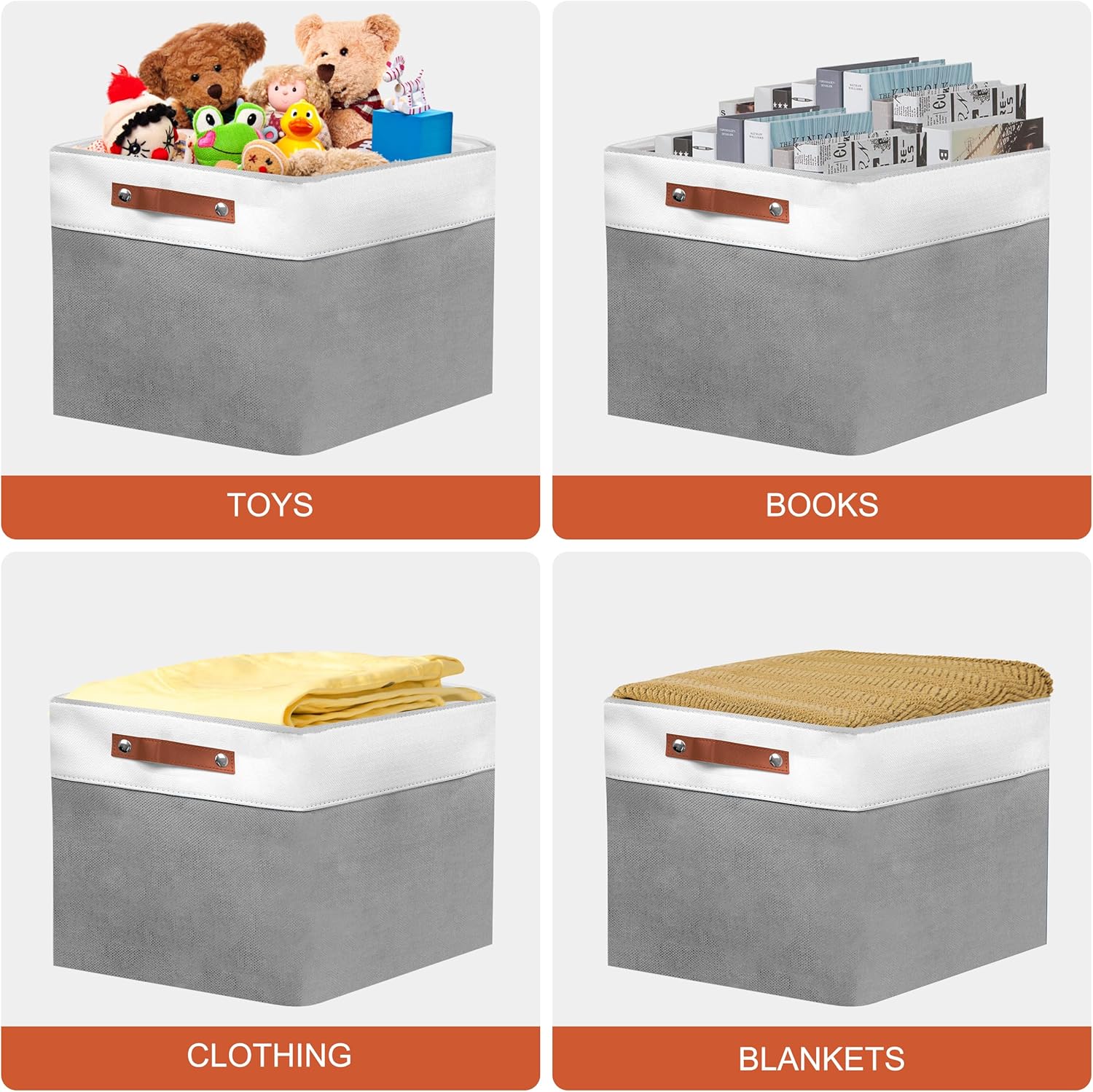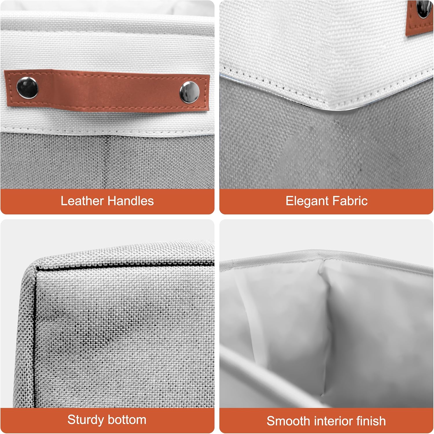 11in Open Fabric Storage Basket with Leather Handles for Organizing, Collapsible Linen Closet Bins for Shelves, Closets, Laundry, Decorative Basket for Gifts. (White&Gray, 3PCS/11x11in)