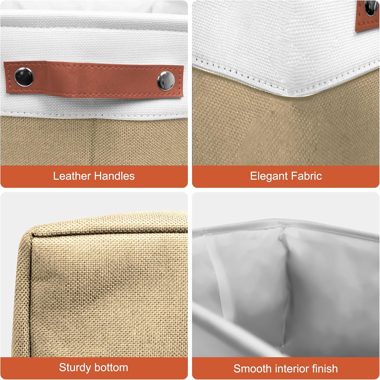 13in Open Fabric Storage Basket with Leather Handles for Organizing, Collapsible Linen Closet Bins for Shelves, Closets, Laundry, Decorative Basket for Gifts. (White&Khaki, 2PCS/13x13in)