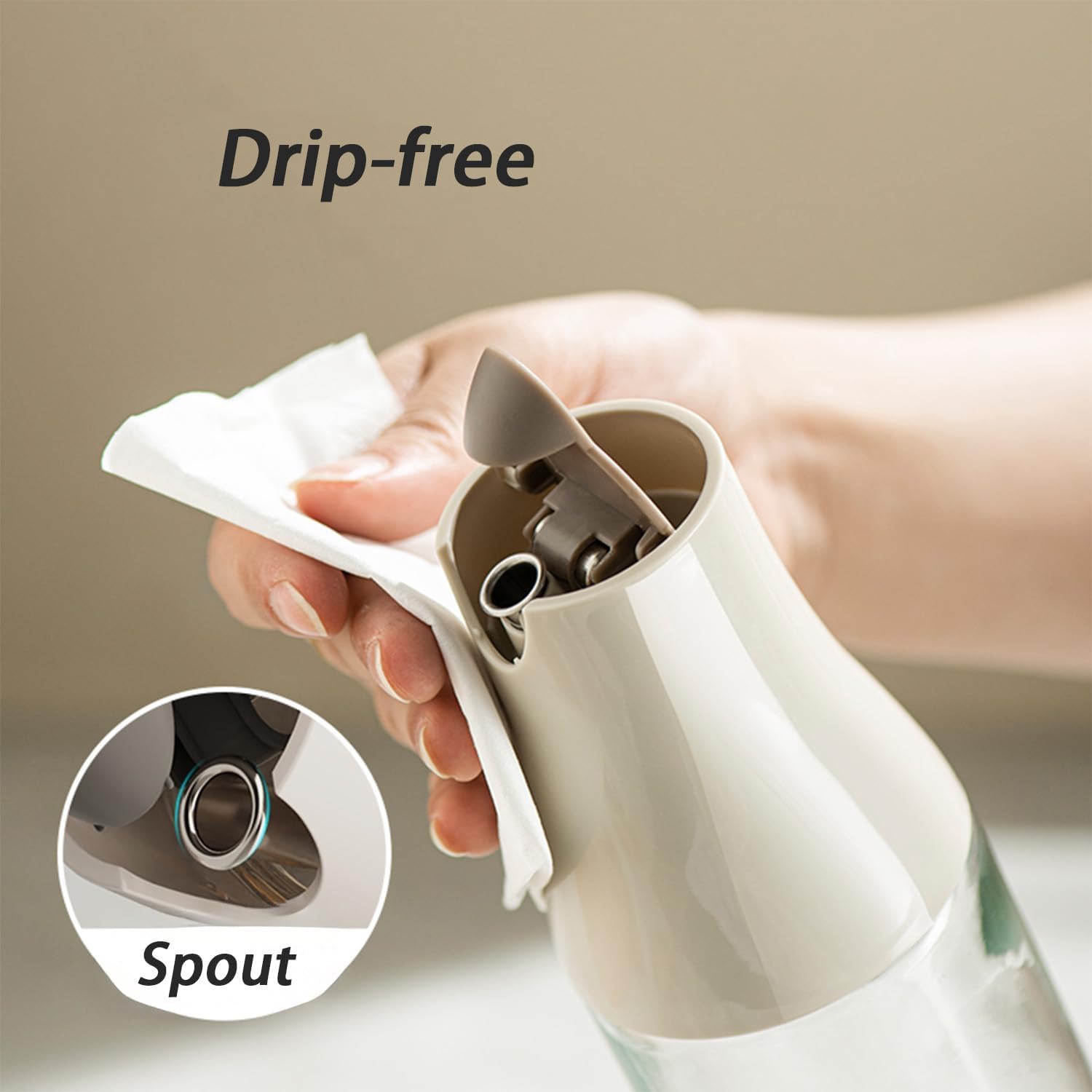 - PREMIUM FOOD-GRADE GLASS AND AUTOMATIC FLIP-TOP DESIGN: The cooking oil dispenser is made of high-temperature resistant, BPA-free food-grade glass and stainless steel spout to ensure durability and no odor. The innovative automatic flip-top design opens smoothly by tilting, preventing oil drips and spills, keeping the countertop clean. The lid closes securely to lock in freshness and prevent oil stains, moisture or oxidation