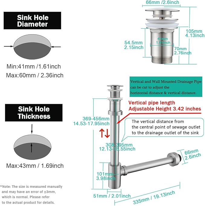 - Height Adjustable: Light luxury and minimalist style. Designed for breaking limits. Vertical pipe length is adjustable14.53-17.95 inches(include the size of pop up drain strainer tail piece),slip joint extension tube is 12inch. Wall Mounted Drainage Pipe can not be adjusted, but it can be cut to adjust the horizontal distance provides greater adjustment space which adapt to your interior design as much as possible.