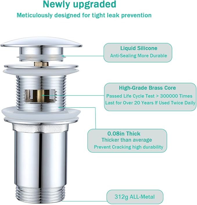 - Fits Standard Drain Hole:Our vanity sink drain fits the drain hole with a diameter of 1.61" to 2.36". Max sink thickness is 1.69".