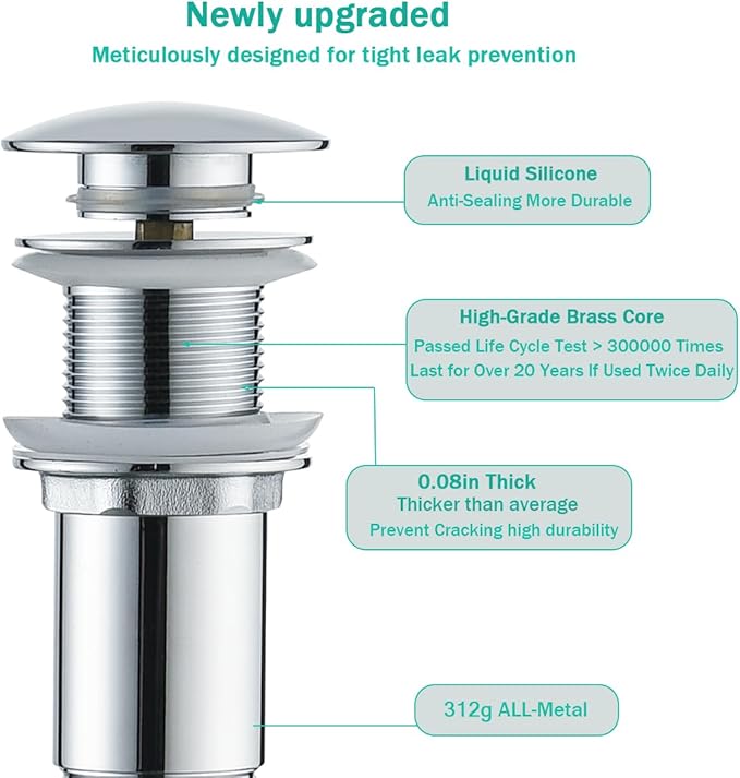 - Fits Standard Drain Hole:Our vanity sink drain fits the drain hole with a diameter of 1.61" to 2.36". Max sink thickness is 1.69".
