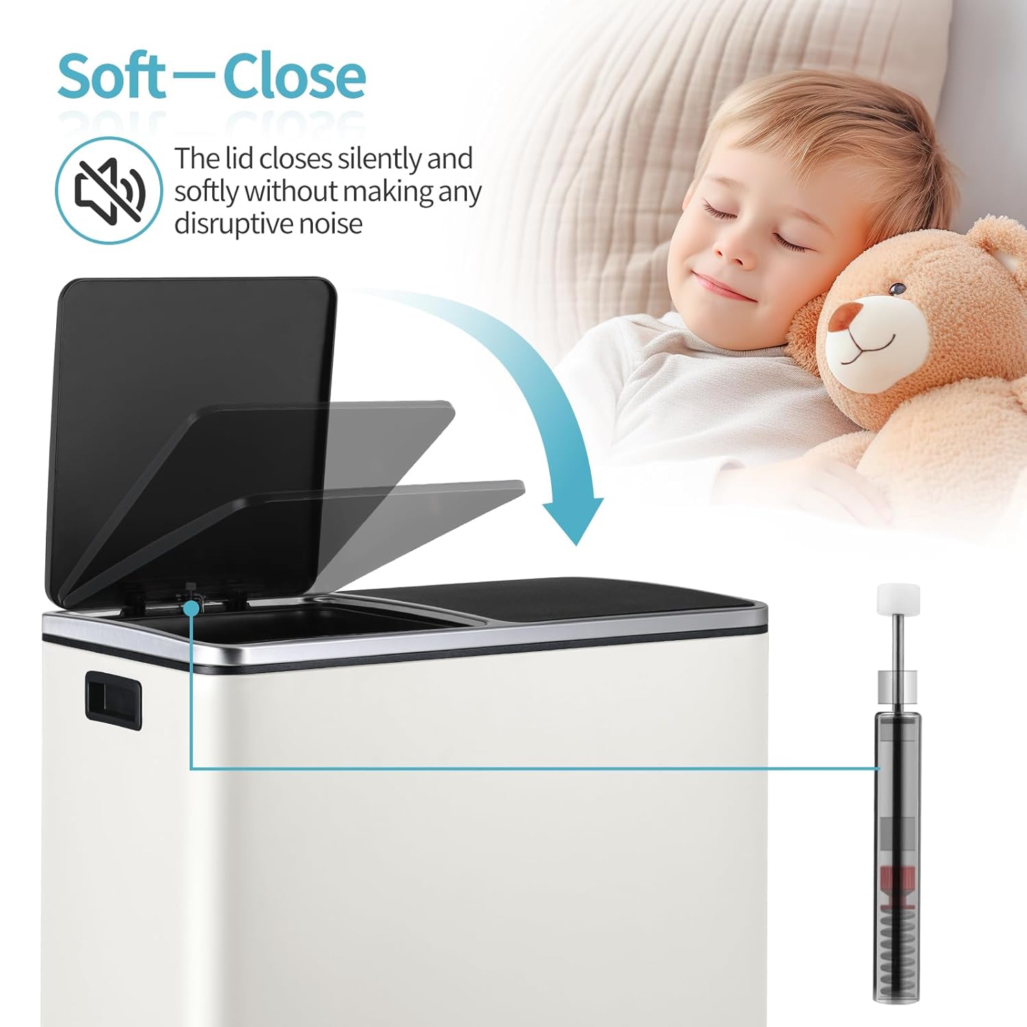 - 2 Slow-Down Lids: Kitchen trash can with lid made of ABS plastic is designed with slow-down. Slow-down lids can keep the recycle bins for kitchen silent and reduce wear. At the same time, the lids have locks that can keep the dustbin open when in use