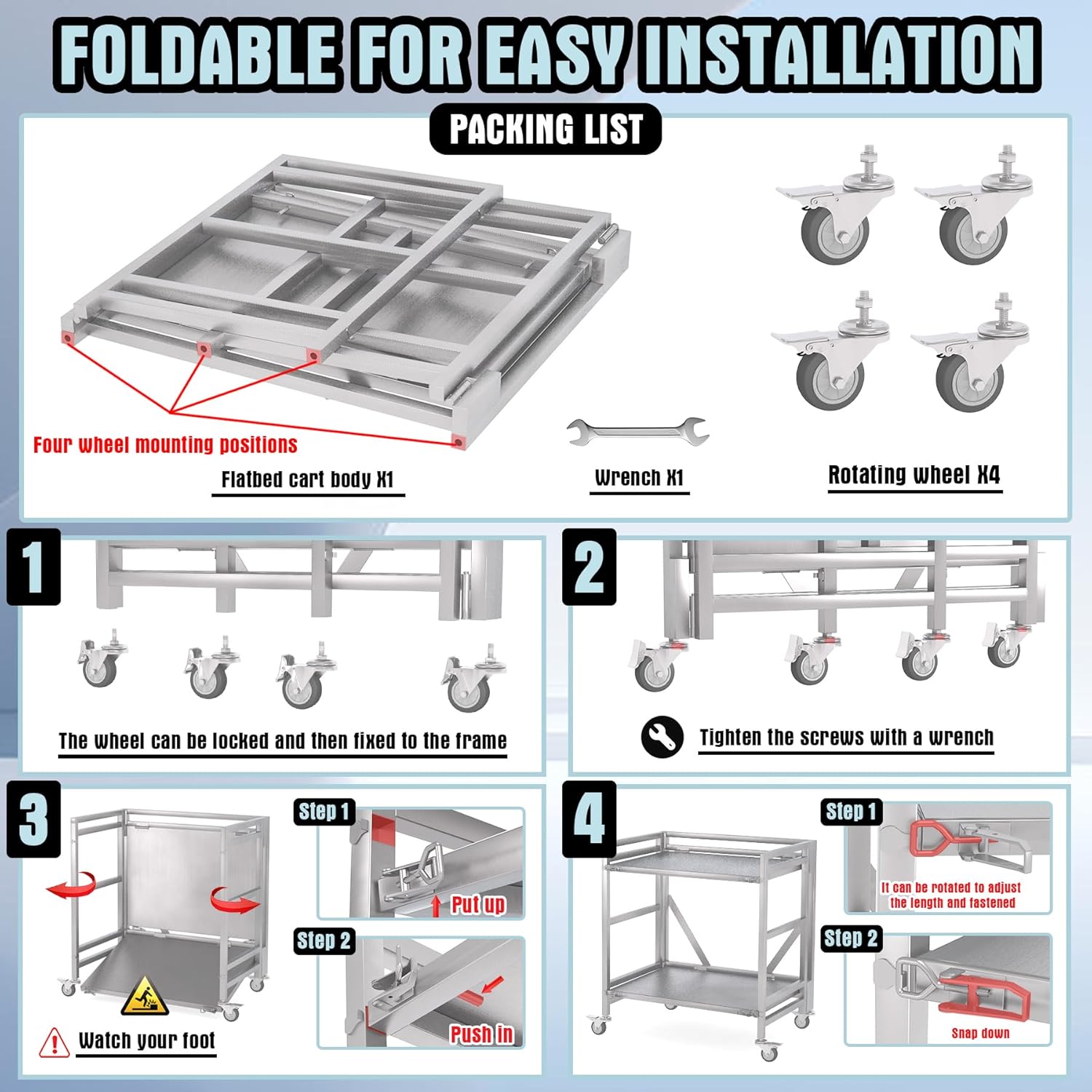 - 【Safe and stable】 it thickens the handrails and plates of the trolley, and performs a detailed treatment on the edge of the trolley to better extend the useful life. Equipped with multiple locking mechanisms, this stainless steel hand cart is securely held in place whether folded or in use, it can be used as a mobile workbench to complete DIY and other activities