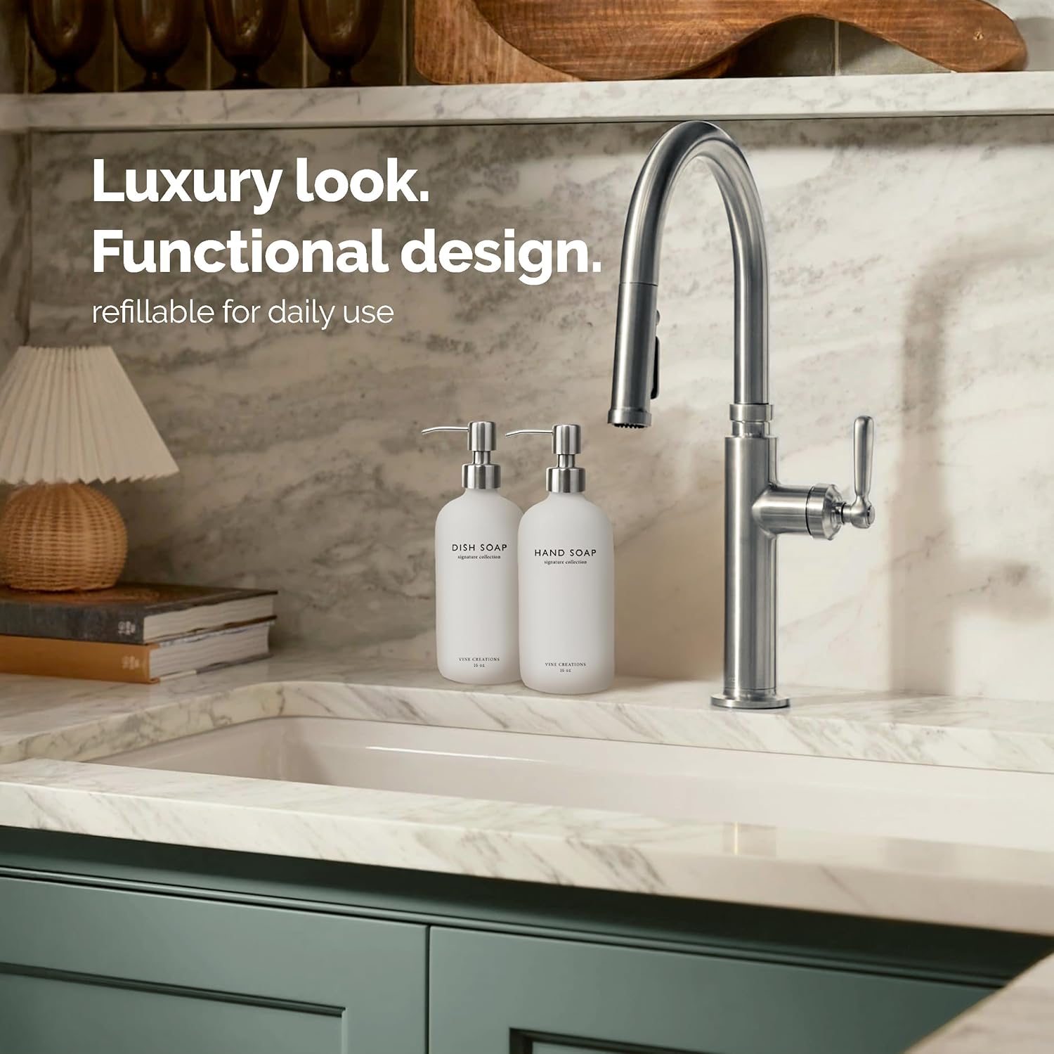 - BUILT TO PERFORM – Each dispenser is topped with a brushed nickel stainless steel pump that’s as durable as it is refined. Rust-resistant, smooth to use, and designed to complement any modern kitchen or bathroom.