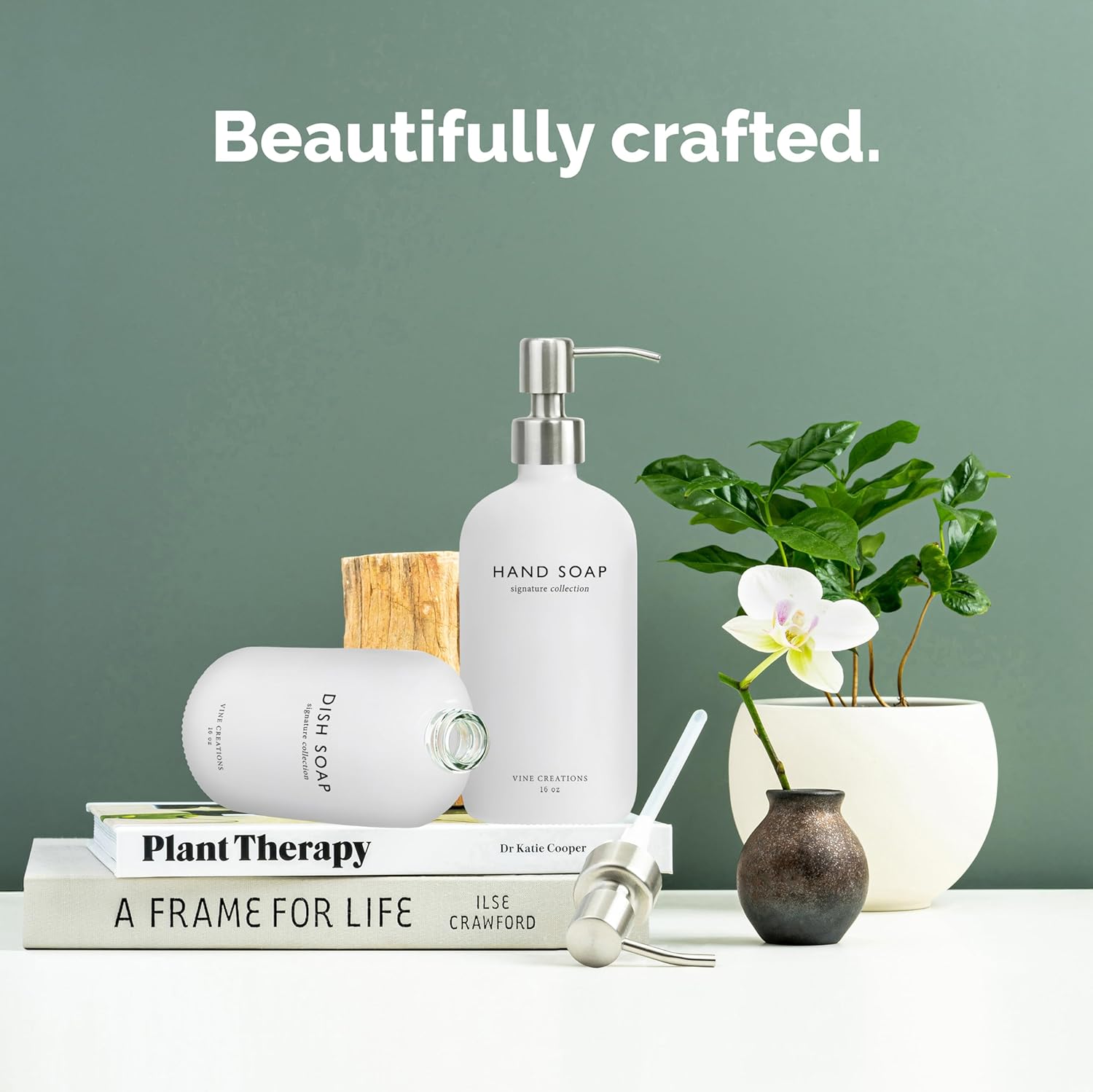 Vine Creations White Glass Soap Dispenser Set, Dish Soap and Hand Soap Dispenser Set with Stainless Steel Pump, 16 oz Glass Dispensers for Kitchen or Bathroom Decor (Matte White Bottle/Silver)
