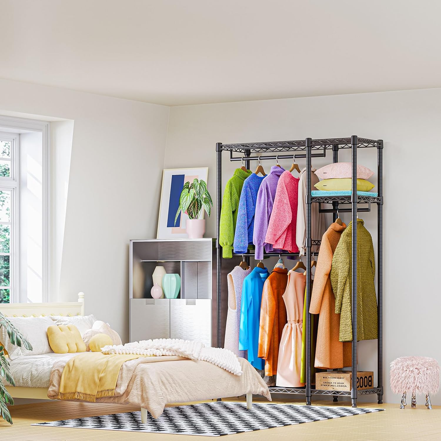 Heavy Duty Rolling Garment Rack 3 Tiers Adjustable Wire Shelving Clothes Rack with 1 Rods and Side Hooks,Storage Closet Clothing Rack Black 15.7" D x 43.3" W x 76.5" H