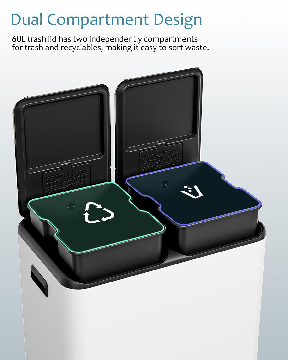 - 2 Removable Inner Buckets: Dual compartment trash can offers separate bins for different types of waste. Each compartment has its lid, which allows you to sort waste efficiently. With a generous capacity of 2 x 8 gallons, combo garbage bin meets your daily needs